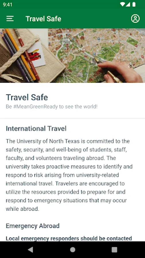 The Mean Green Ready mobile app gives quick and easy access to reference materials and guidelines to help prepare for various emergency situations. It is designed to support emergency preparedness for the UNT campus community by providing general emergency guidelines, resources, important numbers and contact information for use by faculty, staff and students.
