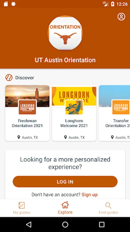 Welcome to The University of Texas at Austin! The UT Austin Orientation app allows you to access guides for various events, including Freshman and Transfer Orientation. The app also includes resources that can help you in your transition to the university.