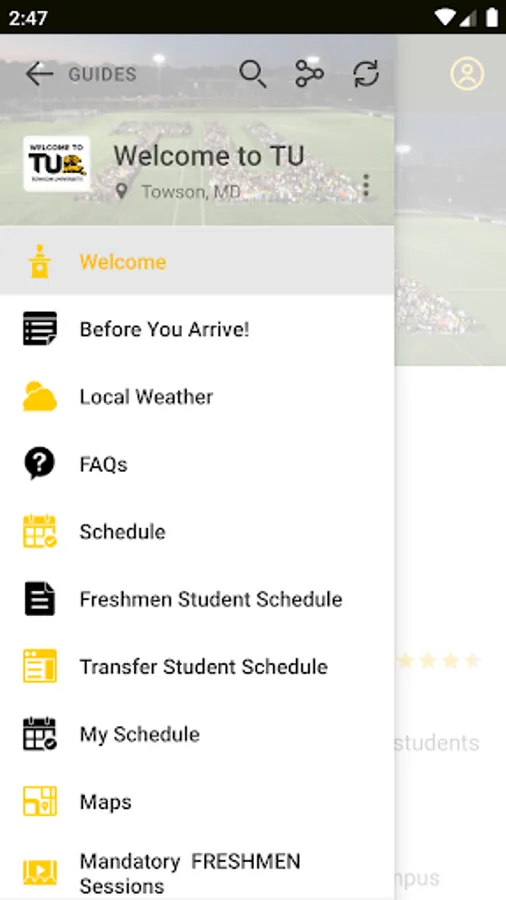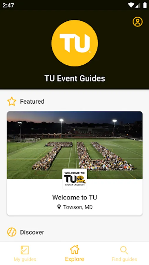 Welcome to Towson University! The TU Event Guides app is the official source for information about TU4U, New Student Orientation, Commencement, Supporting Your Tiger: Family Orientation, Welcome to Towson, and Family Weekend.