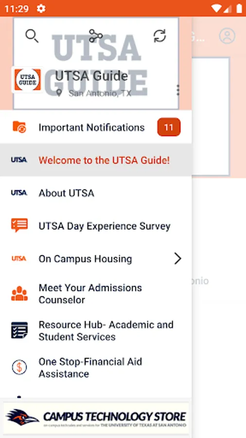 The UTSA Guide App brings the campus to your fingertips. This app will be key whenever we host our UTSA Day Open House events, but it can also be used any time to get updates on UTSA, upcoming events, virtual visits, and more!