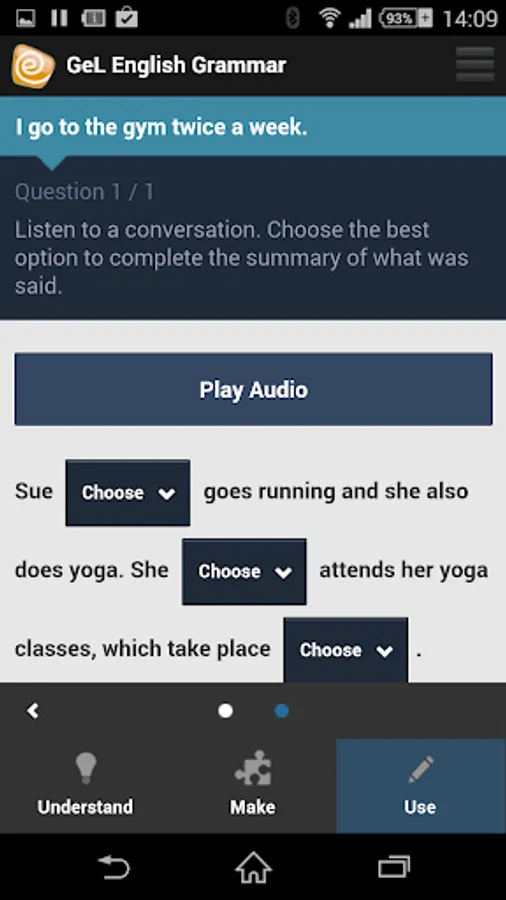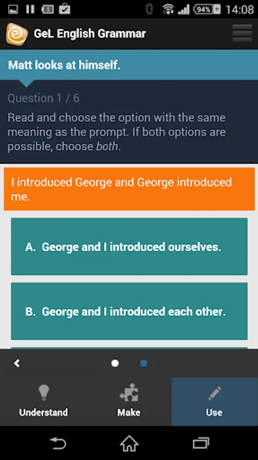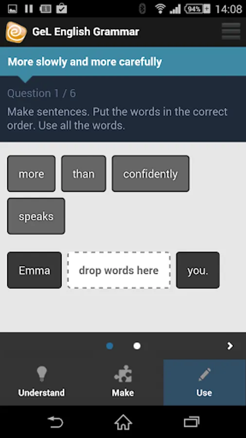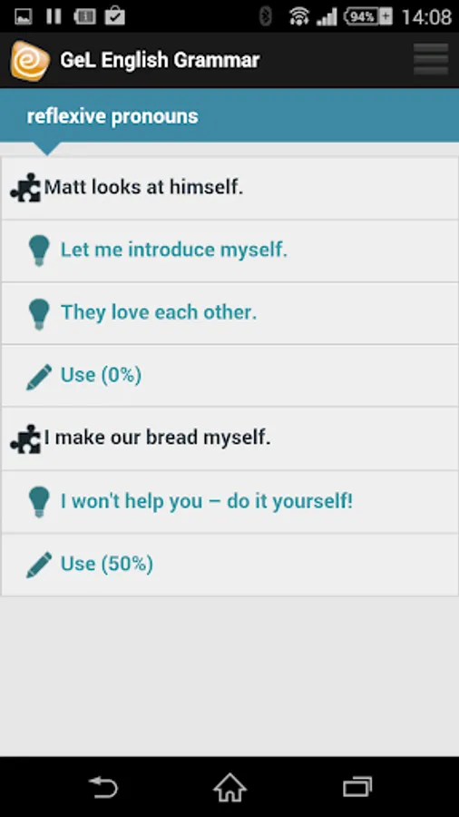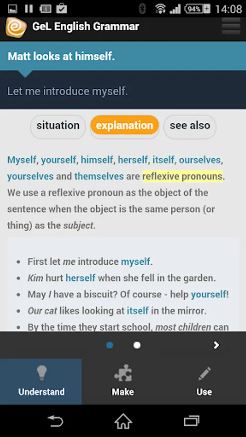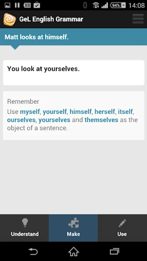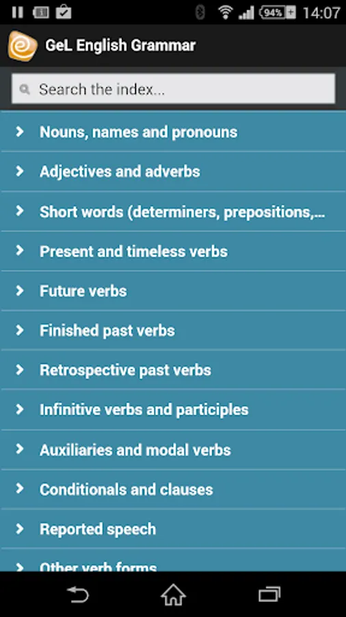 GEL English Grammar is a reference app. It is optimised to perform on your smartphone or tablet. However, it is more than just a dictionary of grammar. Each item is presented in 3 sections: