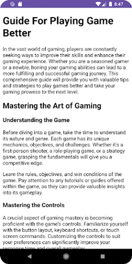 With a user-friendly interface, Guide For Playing Game Better provides a comprehensive collection of tutorials and strategies for various game genres. From action-packed shooters to immersive role-playing adventures, the app covers a wide range of games, ensuring there's something for every gaming enthusiast.