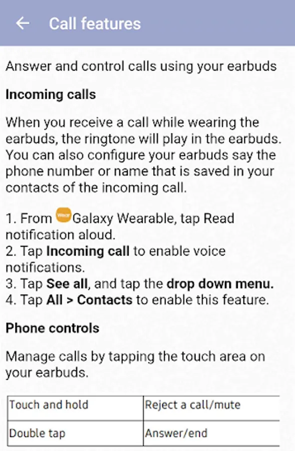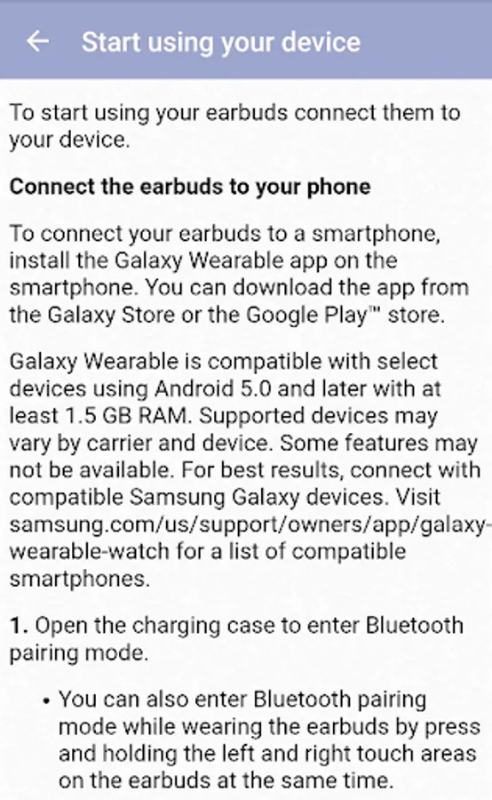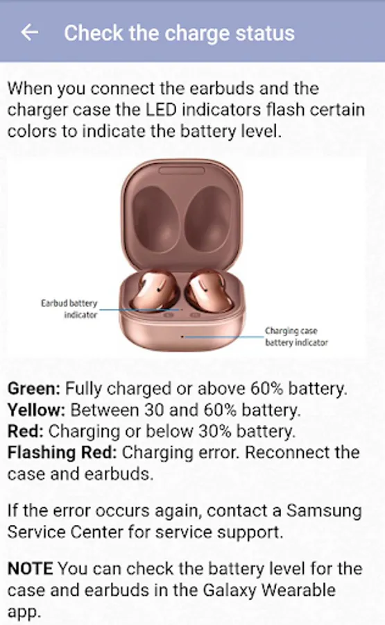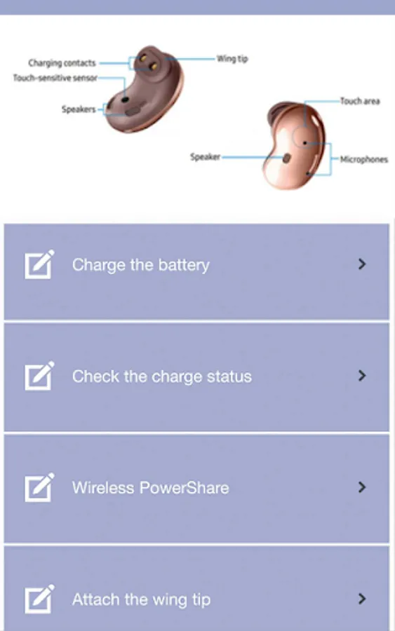 This app is a guide that provides information about Samsung galaxy buds live. From this app, you can learn about wearing earbuds, charging the device battery, using the device's features (calling, touch controls, music, etc.) and so on.