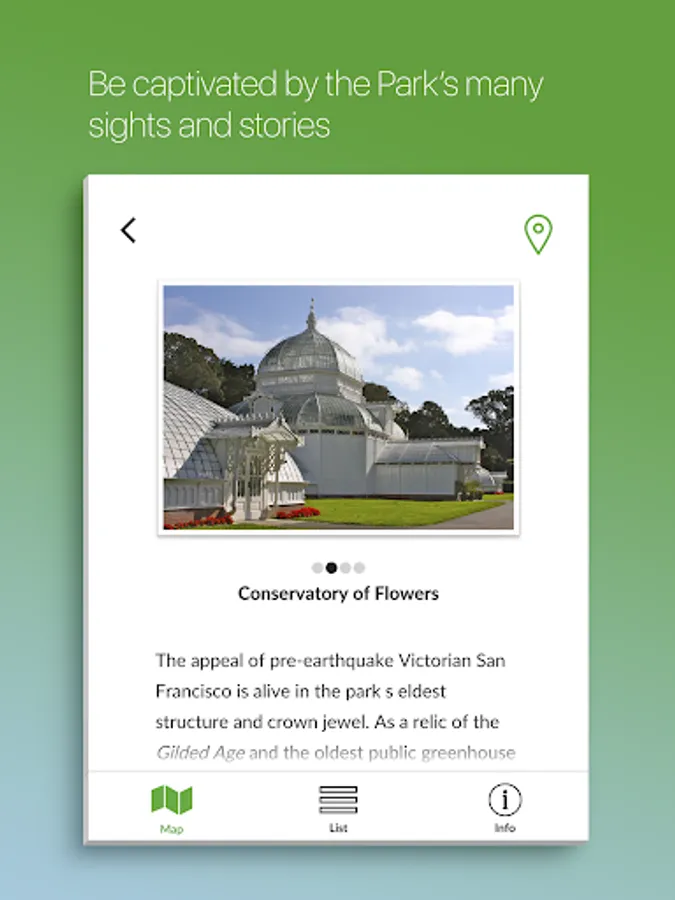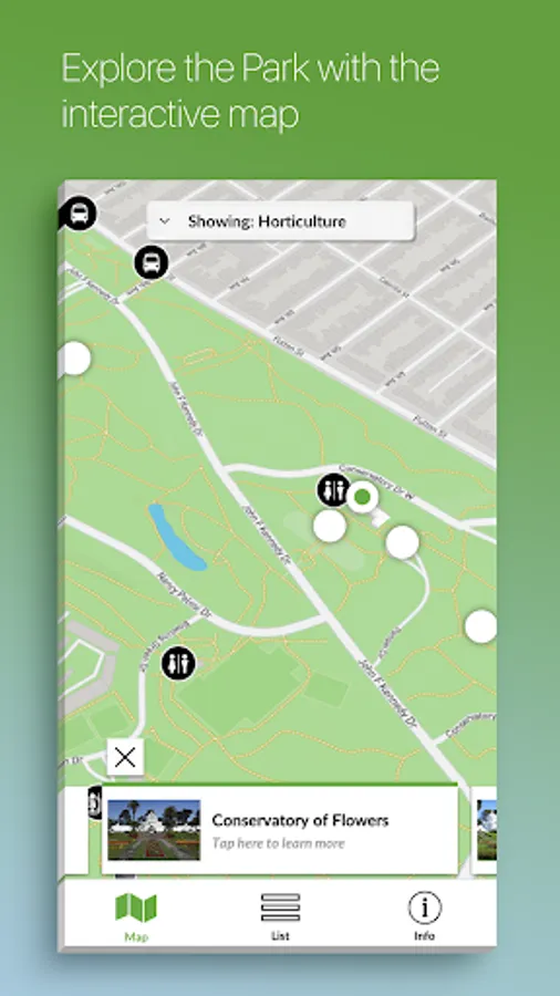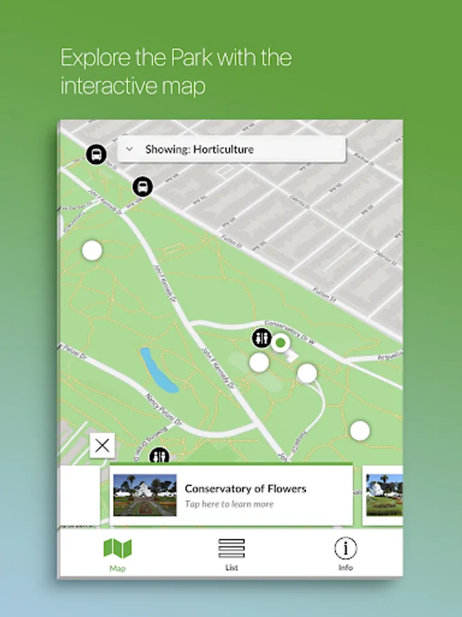 Within Golden Gate Park’s 1,017 acres you’ll discover gardens, playgrounds, lakes, picnic groves, trails, and monuments, plus an array of cultural venues, events, and activities. To help you plan your visit, we’ve highlighted over a hundred of the park’s points of interest. The app features an interactive map that locates you as you move throughout the park. The app provides engaging details about nearby park attractions, as well as information about amenities and other points of interest that allow you to tailor your visit.