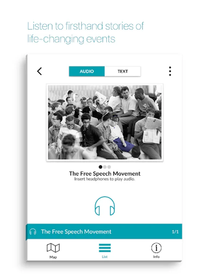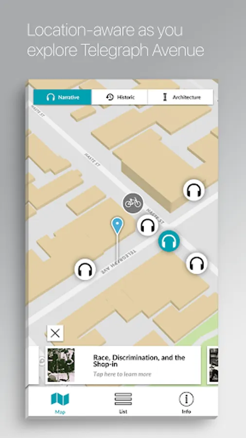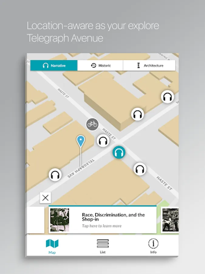 The Telegraph Historical Walking Tour app is an essential companion for your visit to Telegraph Avenue. Through an interactive 3D neighborhood map, you are guided through events that have an impact even today… From student protests and disabled rights, to anti-discrimination work–even the birth of social media. Eleven eyewitnesses describe their experiences and how their lives were changed. You’ll hear these stories available exclusively through the app.