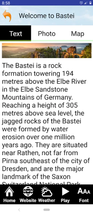 Visit Bastei App is an international co-operation project for Bastei Sandstone Area City Guide between Bastei in Germany and Developers in Taiwan. The App aims at the mobile guide requirement to provide the best practical location-based (GPS) guide service for visitors. Main features includes text and audio guide, AR lcoation guide and VR Panorama (optional) for per places. Also the usage of interfaces of App are very properly designed for the mobile visitors. The English (and Chinese) contents are ready automatically for the region setting of your phone.