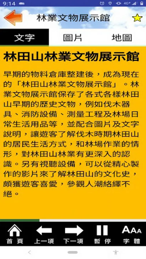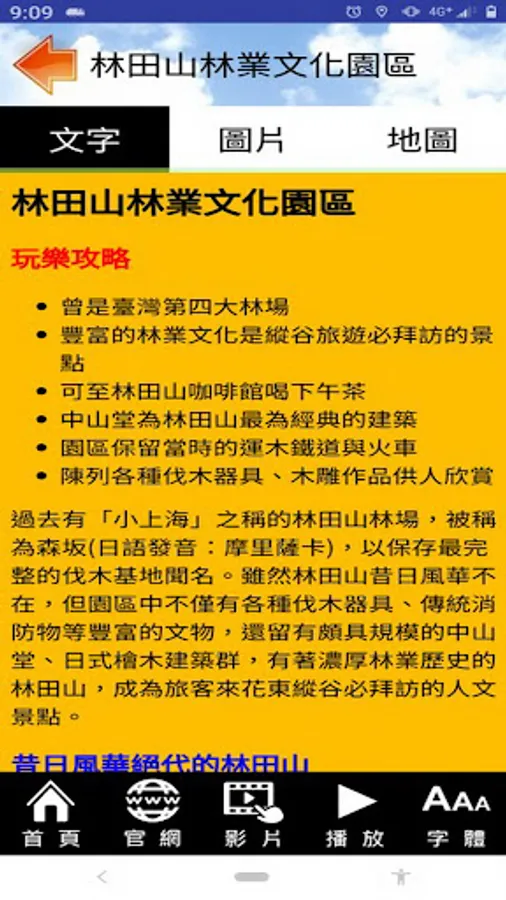 The Lintianshan Forestry Cultural Park preserves the most complete logging base in Taiwan. The park is rich in cultural relics such as various logging tools and traditional fire fighting equipment, as well as the Zhongshan Hall built of high-grade cypress, the Japanese-style cypress building complex, and the Lintian Mountain with a strong forestry history, which have become cultural attractions that tourists must visit in the East Rift Valley. This software collects and organizes the open data of the Huadong Rift Valley Scenic Area and the Forestry Bureau. The goal is to develop a practical action guide that is easy to use and free to download and experience Lintian Mountain, allowing users to easily explore Taiwan's most attractive forestry parks.