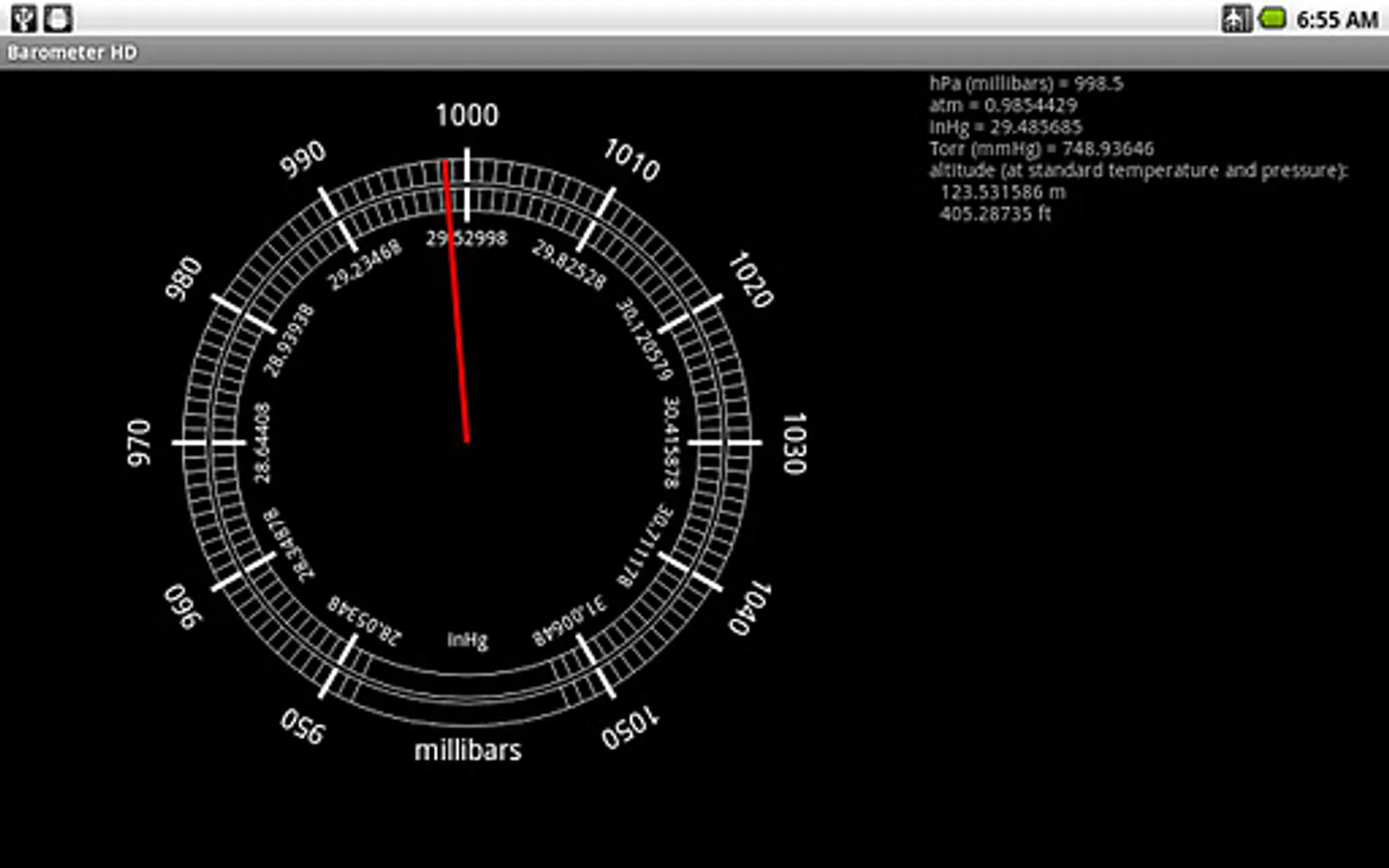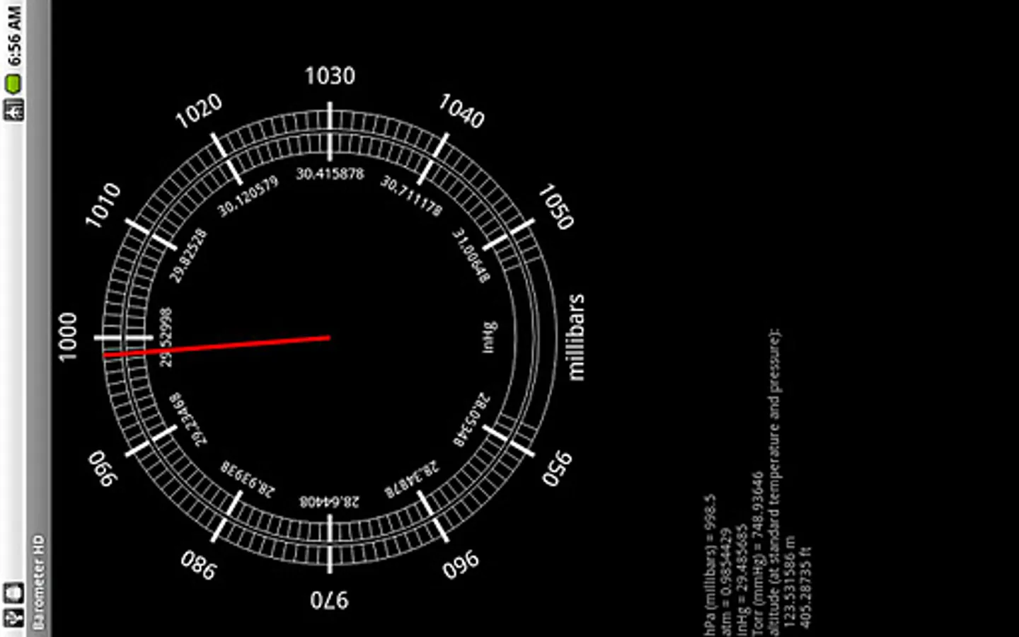 Barometer HD shows you the current barometric pressure in different units, including inHg, mmHg, hPa, atm, millibars. It also shows your altitude at STP.