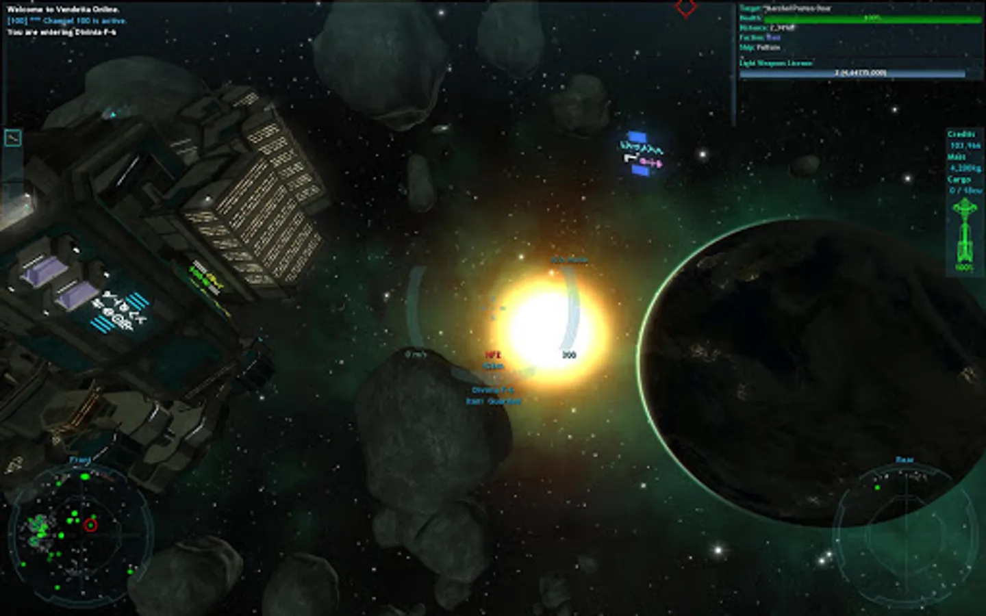 Vendetta Online is a free, graphically intensive and cross-platform MMORPG set in space. Players take the role of spaceship pilots in a vast, persistent online galaxy. Trade between stations and build an empire, or pirate traders who dare to pursue routes through areas of lawless space. Fight other players, or cooperate with friends to push back the mysterious Hive. Mine ores and minerals, gather resources, and craft unusual items. Join the military of your nation, and participate in massive online battles (see the trailer). A wide variety of gameplay styles are available, from the the intensity of huge battles and realtime PvP, to the low-key enjoyment of quiet trading and mining in less dangerous areas of the galaxy. Play the style of game that suits you, or that suits your current mood. The availability of relatively casual and short-term goals allows for fun when only a little time is available to play.