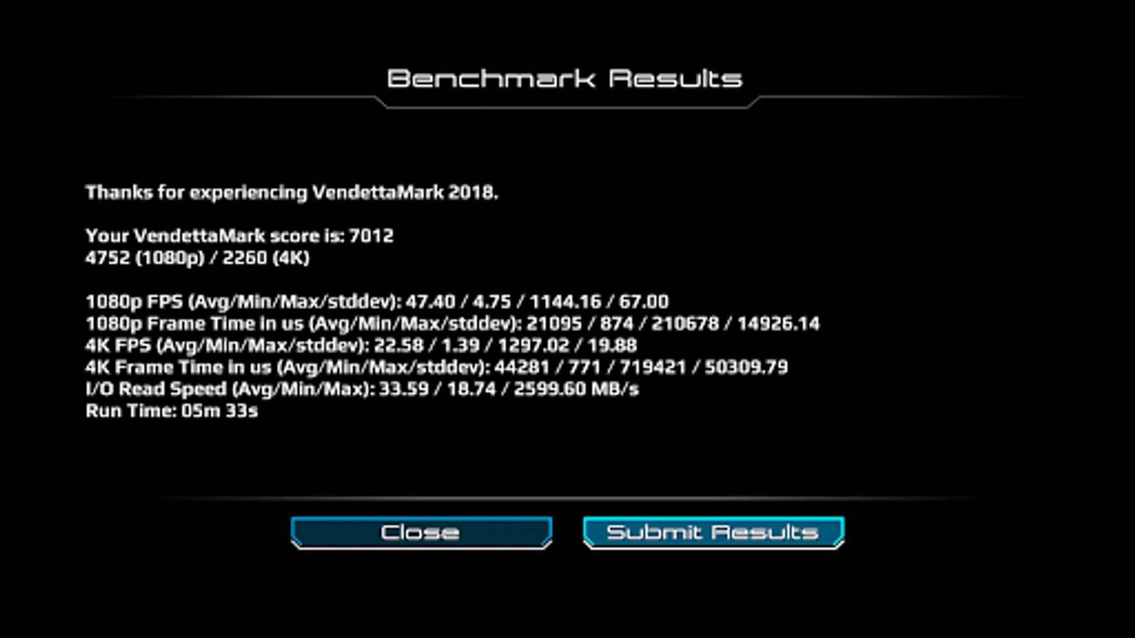 VendettaMark 2018 is a fixed-timestep benchmark, meaning that all hardware will render the same number of frames, but the length of time to render each frame is measured and accumulated to determine the "score".