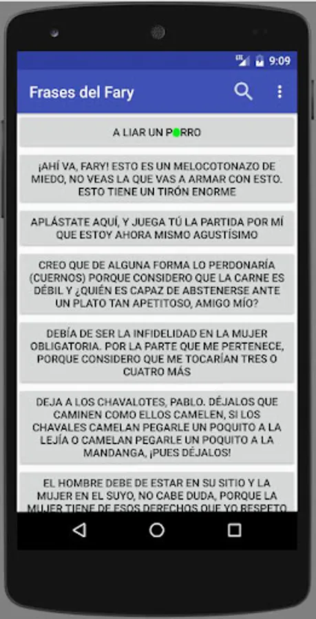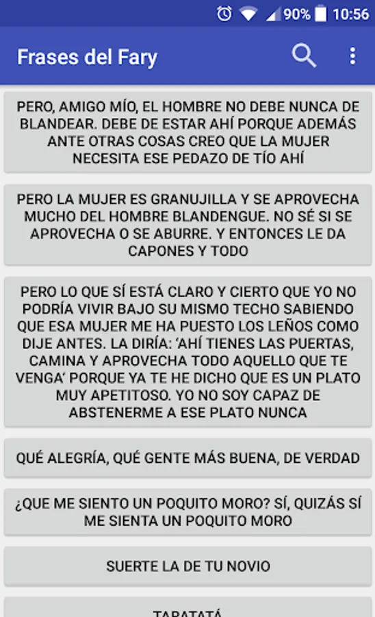 To play any phrase simply press above it. If you want to send audio through instant messaging applications, keep your finger few moments on a sentence, but if you see that nothing happens, make sure you have the permissions of the application enabled by going to "Settings", then "Applications" and finally to "phrases Fary".