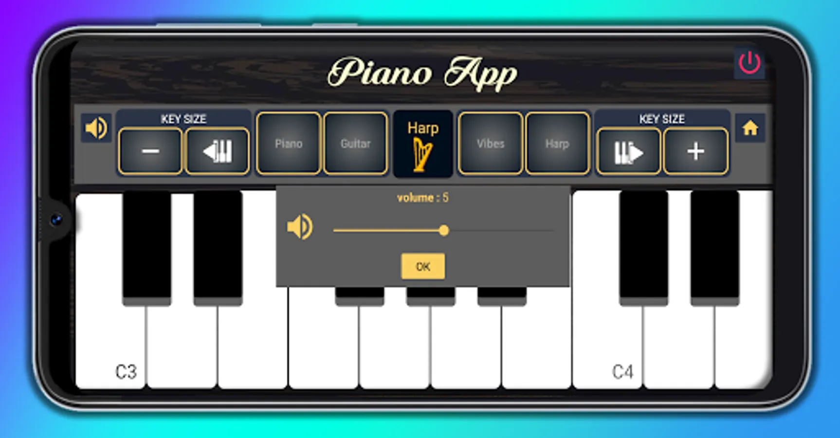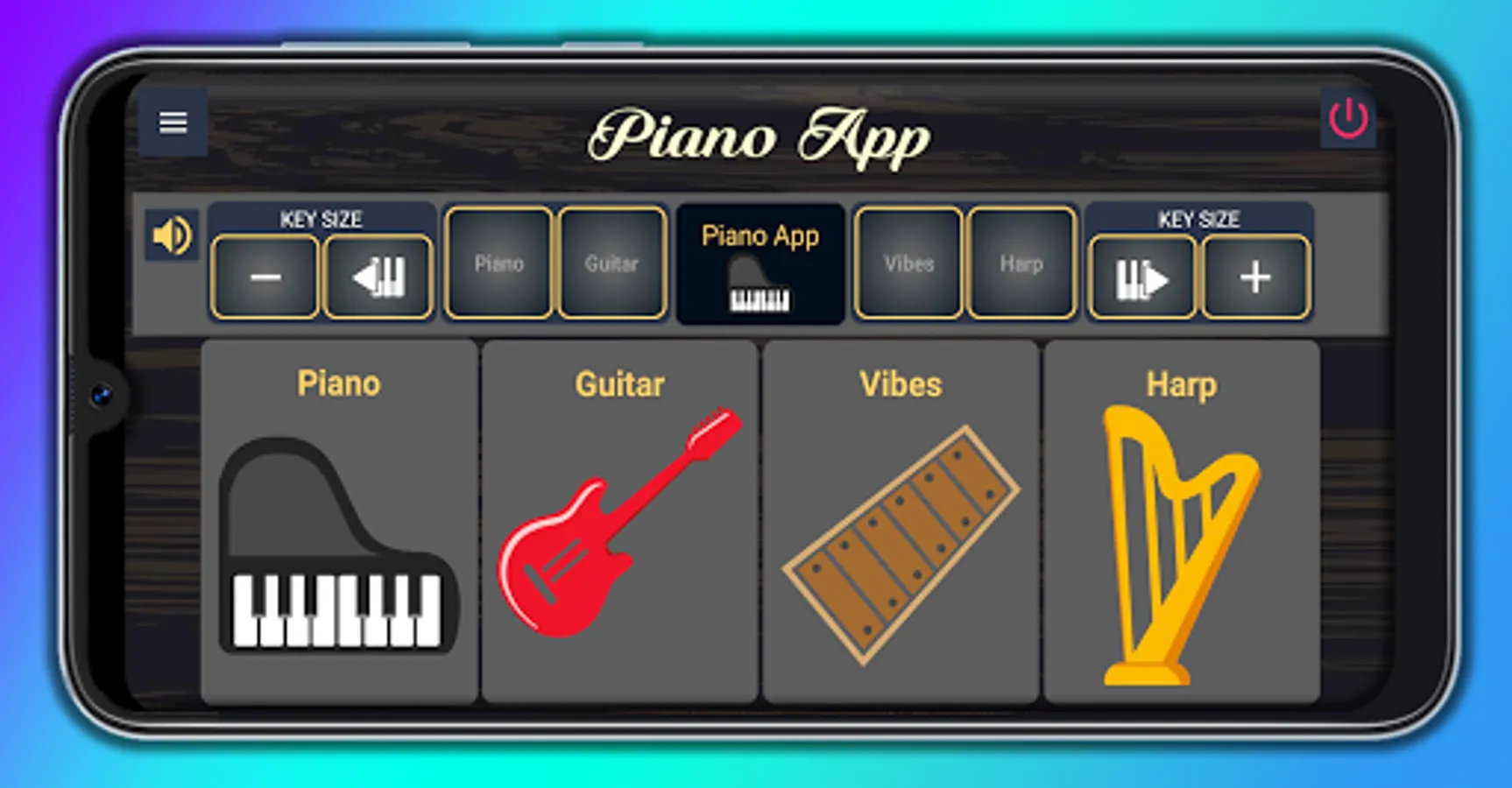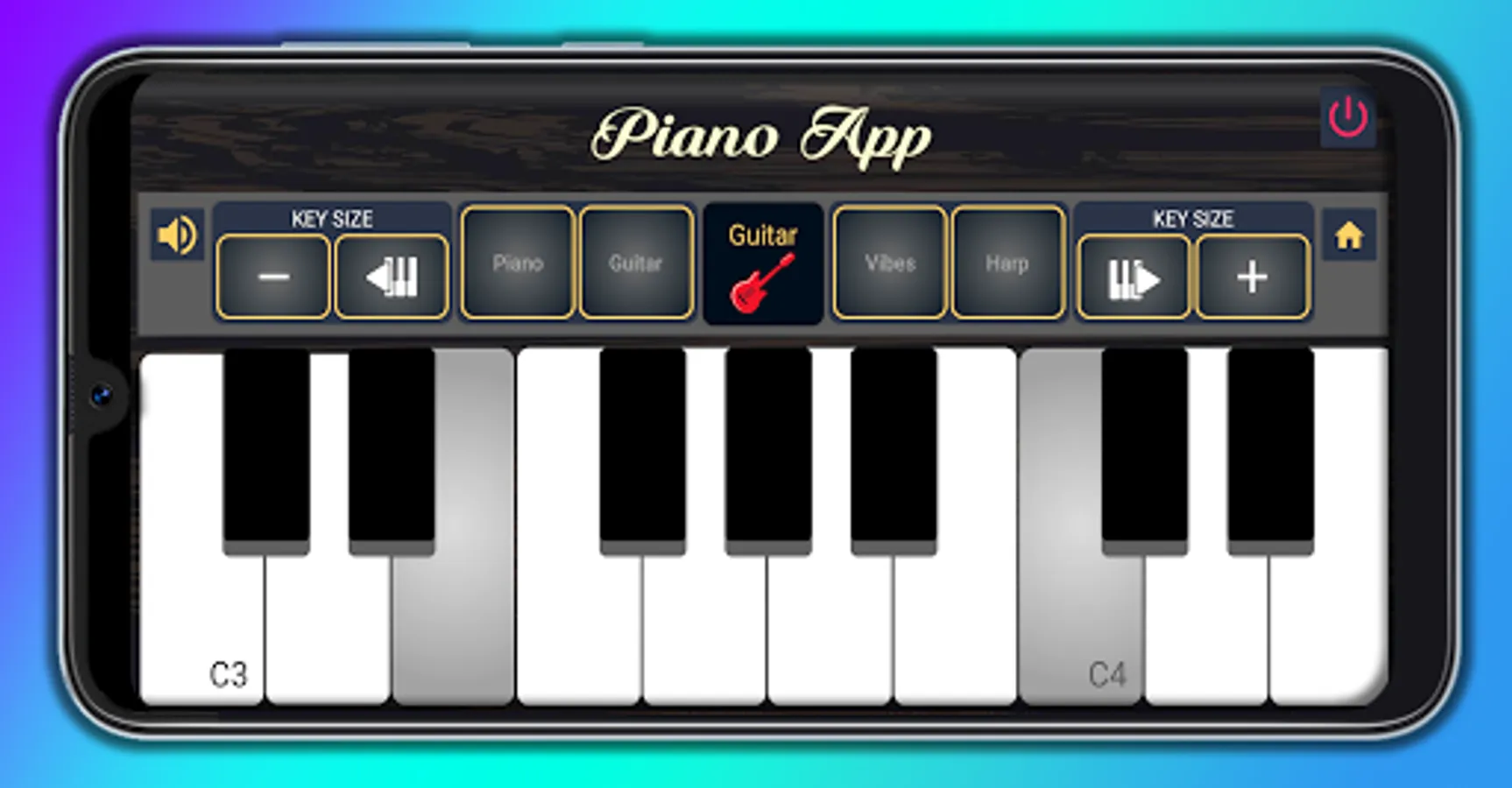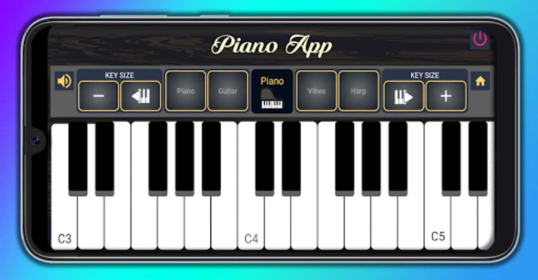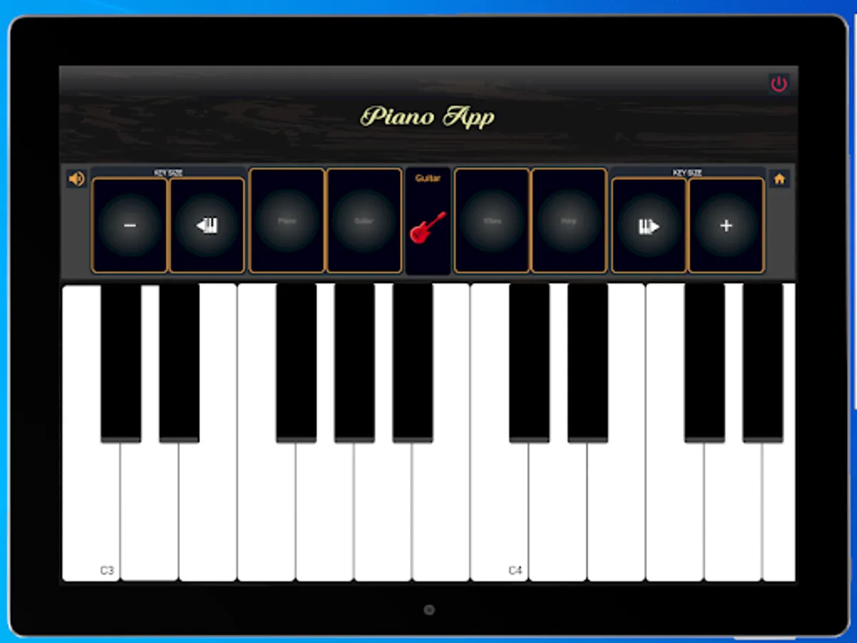 It is a real piano virtual instrument for Smartphone with HD audio quality. It has keys (Keys) with sounds of Piano, Guitar, vibes and harp. To improvise and practice at the same time. The application is basic easy to use. The size of the keys is adjusted to your disposition according to your playing time.