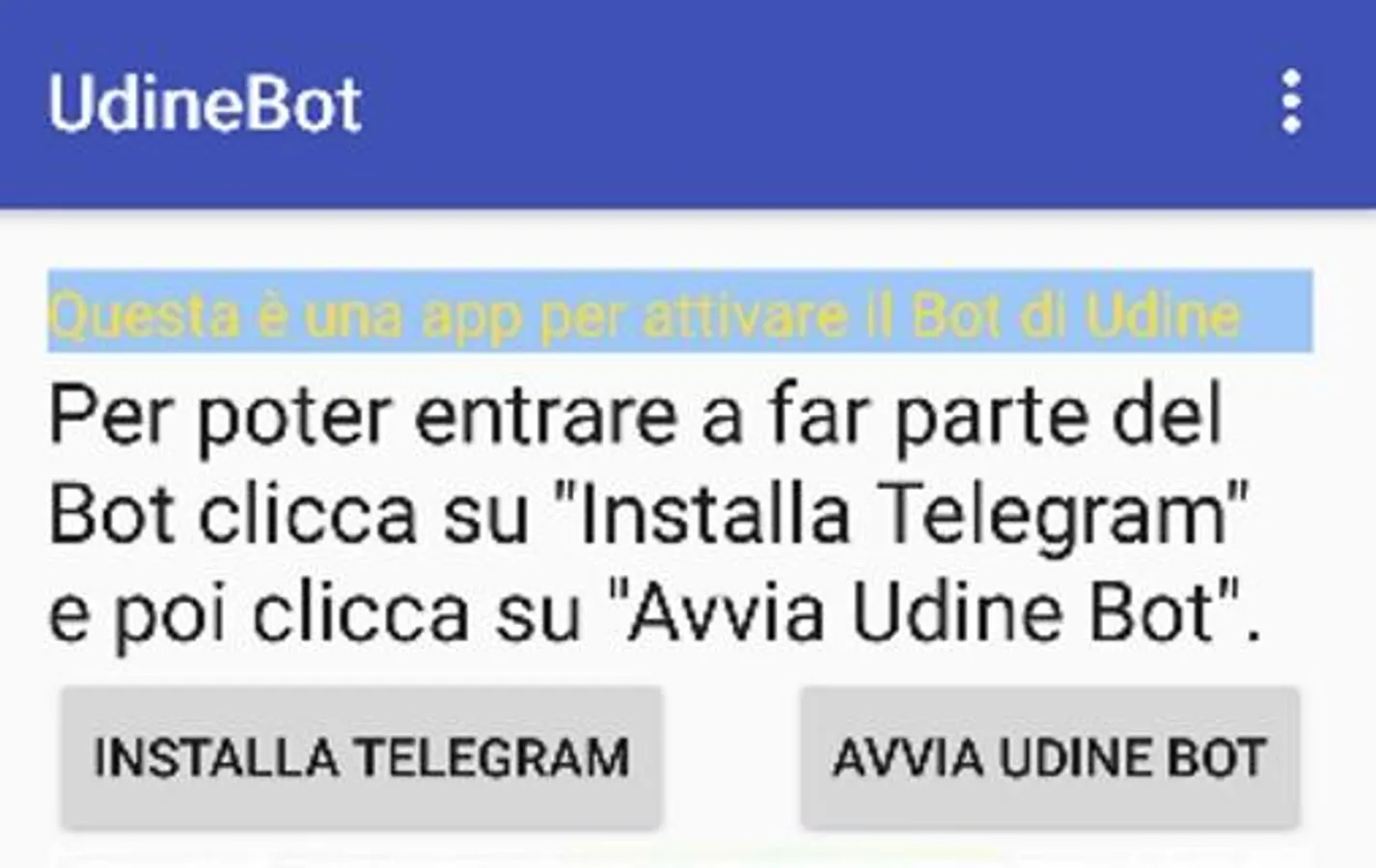 To facilitate the activation of the "Friuli Venezia Giulia Live & Events" Bot which you can find on telegram (by searching @udinebot) a special application has been created. After activating "Friuli Venezia Giulia Live & Events" you can receive news, information, events or other for Friuli Venezia Giulia and you can also use the integrated services. More information can be read on www.udinebot.guion78.com.