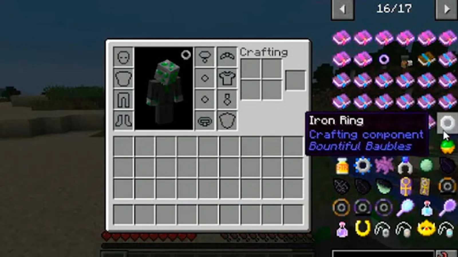 The Baubles Mod for Minecraft is a tool that has stuff players can use and is a tool made for Mod players to add their own jewelry and bead items to the characters inventory. After installing this tool, players will notice seven new boxes in the characters inventory. In these boxes, we can put rings, amulets, and belts, and other items too.