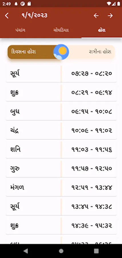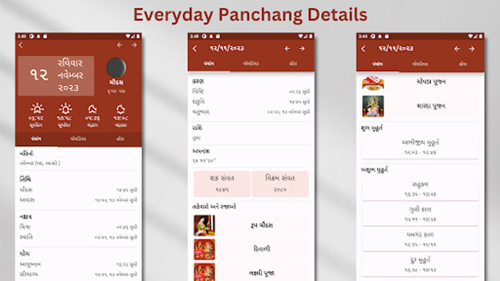 Gujarati Calendar 2023 and Panchang 2023 app with every Panchang detail, Choghadiya, Hora, Festivals, and more! Access daily, weekly, monthly, and yearly Rashifal, different Muhurat, weather information, and much more, all available in Gujarati and English.