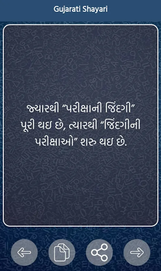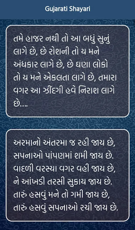 This is the world's No.1 Gujarati Shayari app. 5,000+ શાયરી This application contains best and Latest શાયરી , Status and SMS in Gujarati Language.