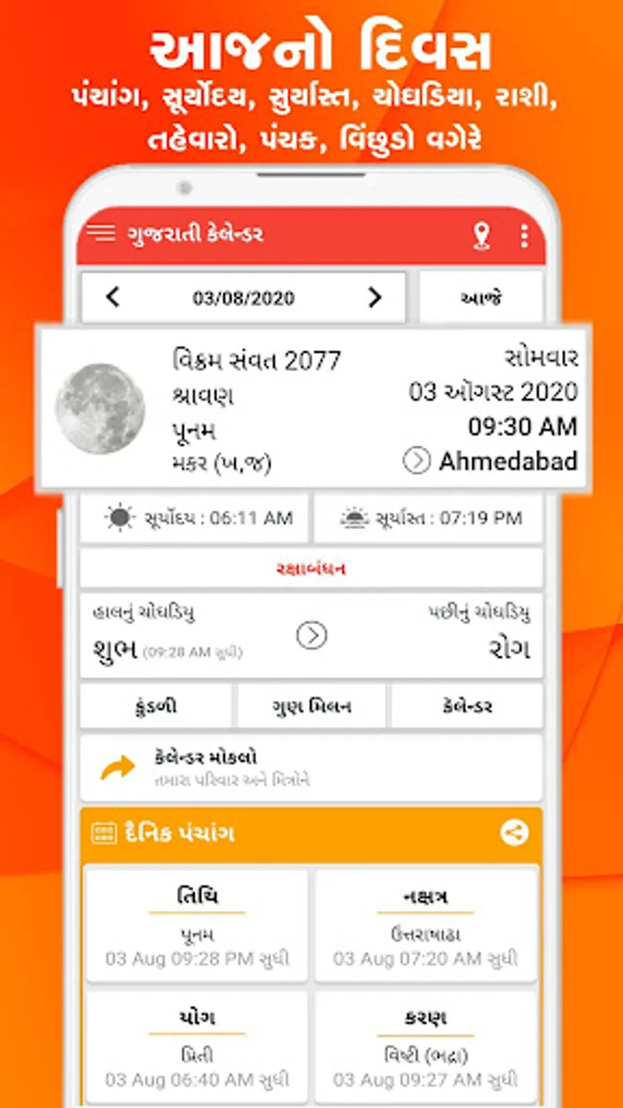 You can view today's Tithi, Nakshatra, Yoga, Karan, Choghadiya, Sunrise, Sunset, SunSign, MoonSign, Festival and holidays on one screen.