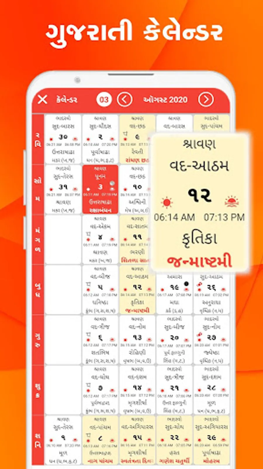 ગુજરાતી કેલેન્ડર ૨૦૨૨ માં તમે પંચાંગ, તિથિ, નક્ષત્ર, જાહેર રજાઓ, વ્રત કથાઓ, જન્મ રાશી, ચોઘડિયા, પંચક, વિંછુડો, કુંડળી, ગુણ મિલન, વરસાદના નક્ષત્રો - લગ્ન, ગૃહ પ્રવેશ, મિલકત ખરીદી, વાહન ખરીદી વગેરેના મૂહર્ત વગેરેની વિગતવાર માહિતી મેળવી શકશો.