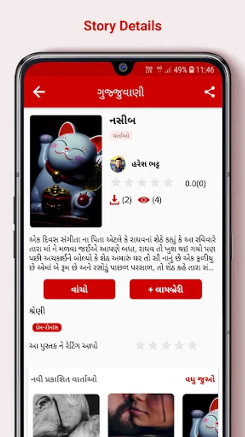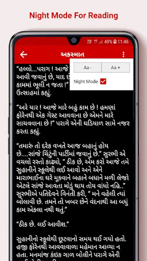 Resize font support is available for changing font size and to fit the content in your display perfectly. You can also share an story with basic story description.Night Mode reading is also available for smooth reading.
