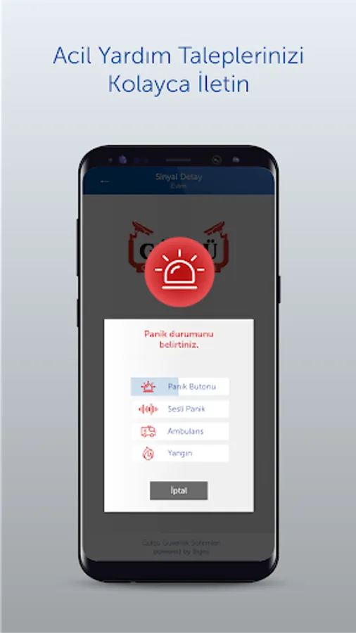 You can send a panic alarm to the Alarm Center with the Panic Button and you can also ring the siren if you need to.