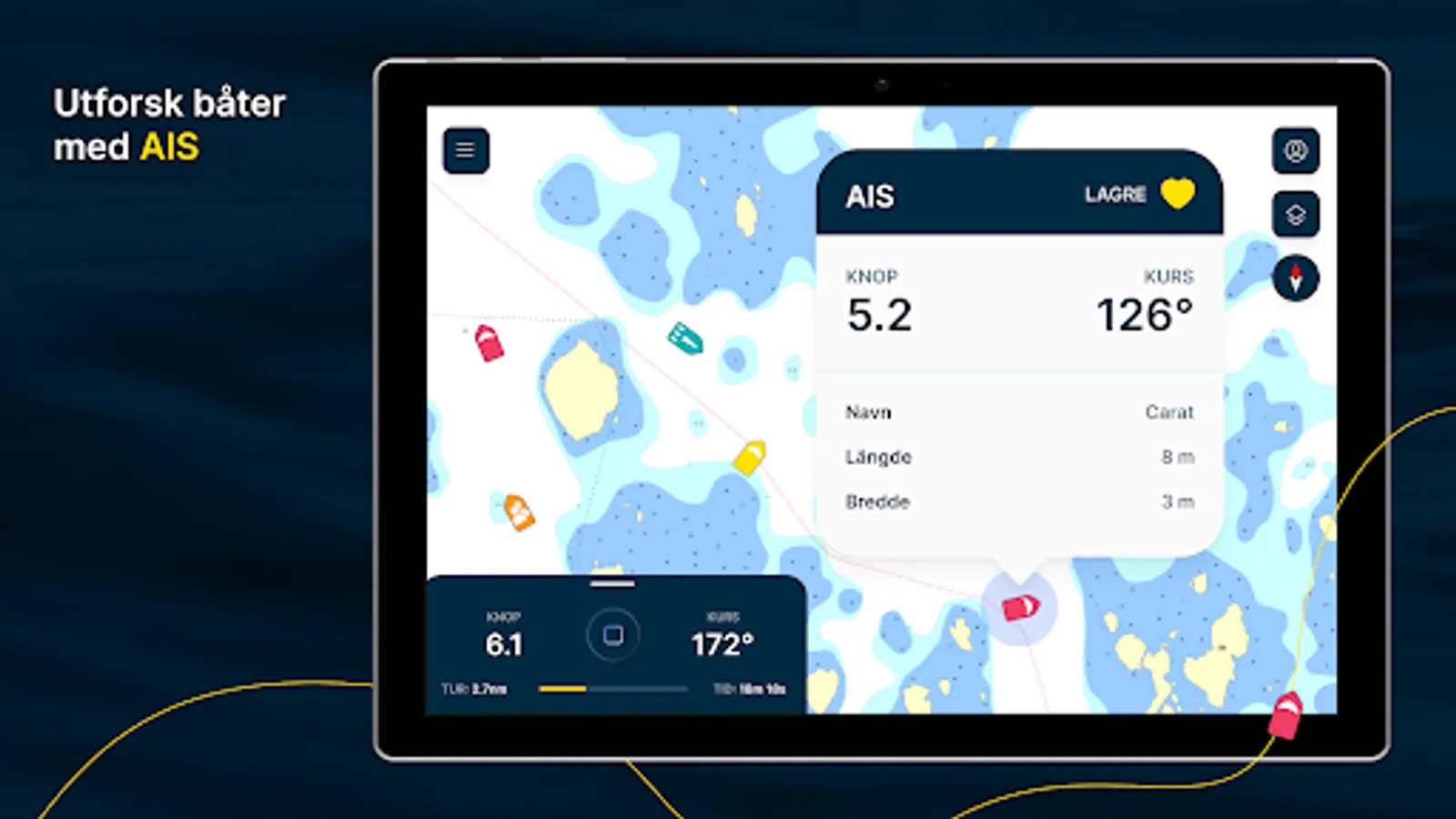 Navigate with local and customized sea charts and aerial photos that you can also download and use offline. Clear instrument panel with speed in knots (SOG) and heading (COG). Customize your view with zoom, lock the boat's direction and add the map layers you want, such as ports, AIS boats, your own saved locations and wind and weather reports. Let our anchor watch keep track of the boat's position if you are at anchor.