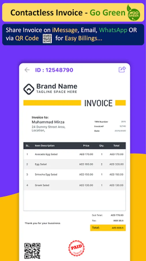 -Share invoice on iMessage, Email, WhatsApp or QR Code
