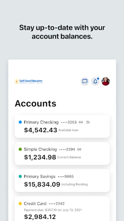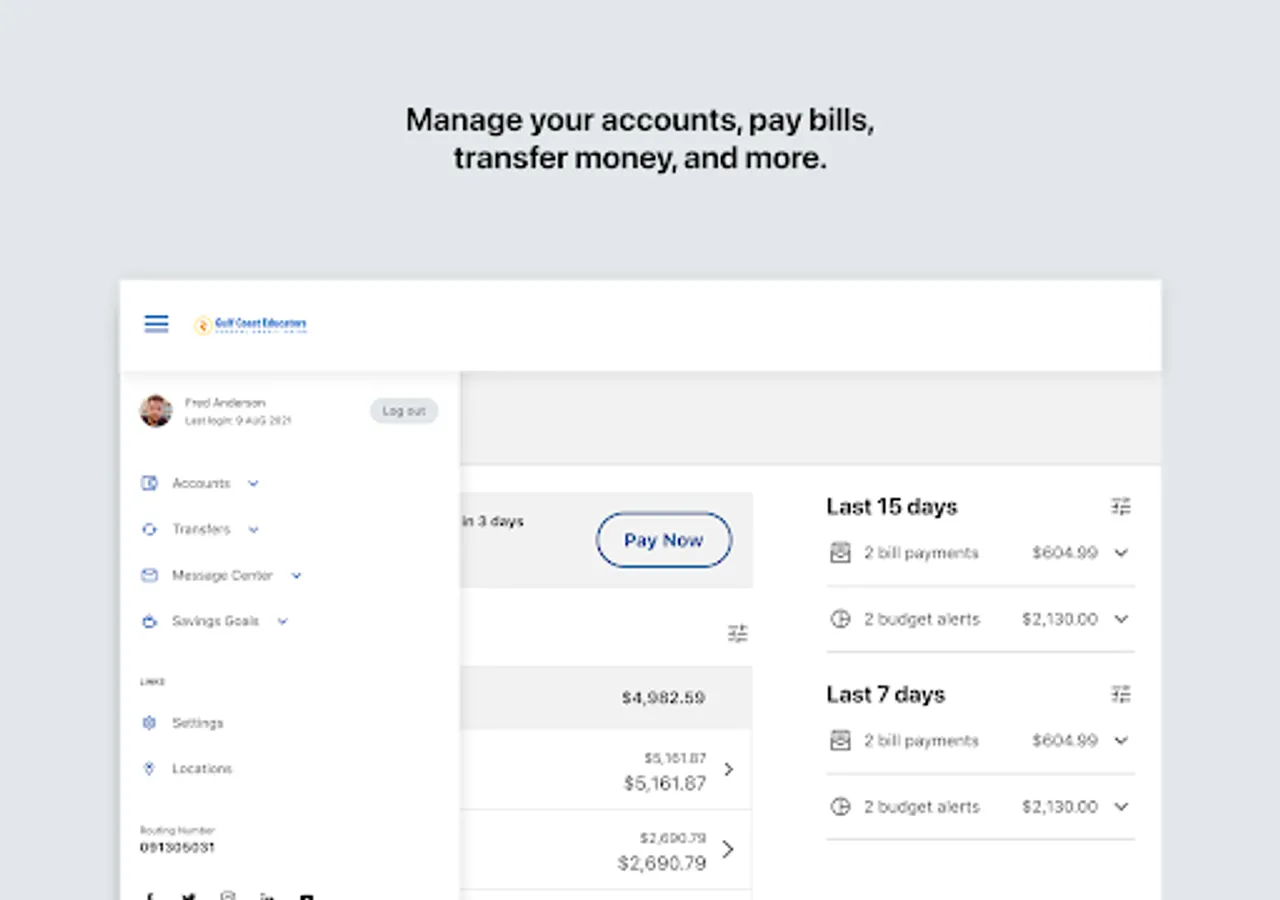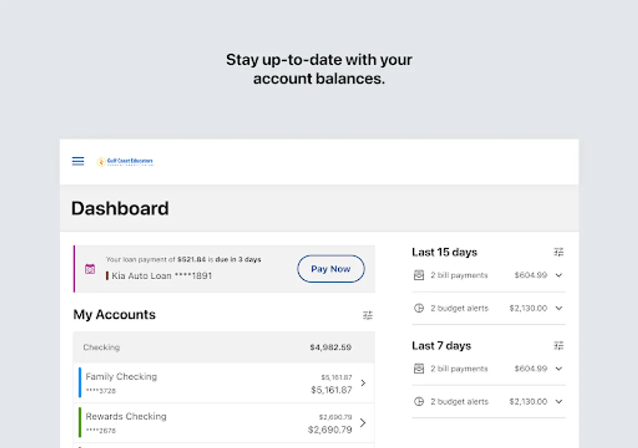 Gulf Coast Educators FCU digital banking including account access, transfers, billpay and remote check deposits.