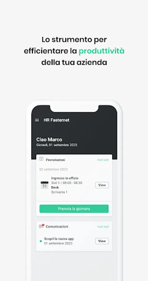 A complete tool to manage real-time communication between employee and company, check the attendance register and work remotely or on-site, book company resources and much more!