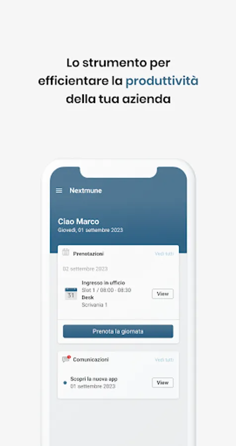 Nextmune Italy HR allows all your collaborators to carry out many of their daily activities in a simple and innovative way, directly from their mobile device. In addition to allowing and facilitating the possibility of working on the go, it allows you to always be in touch with the headquarters.