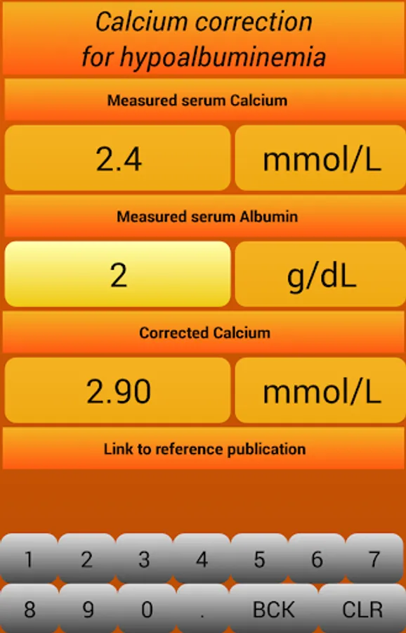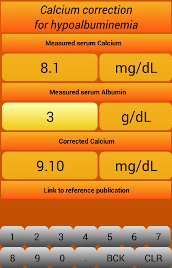 This easy to use app calculates the adjusted serum Calcium for patients with low Albumin levels. Since the major part of Calcium in serum is attached to Albumin, the measred "total Calcium" should be adjusted accordingly. The formula used is the one described in Payne et al: [https://www.ncbi.nlm.nih.gov/pmc/articles/PMC1587636/]. Data entry is very convenient due to the customized keyboard. Both mg/dL and mmol/L can be used for the measured Calcium level and both mg/dL and g/gL for the Albumin level. A free access link to the original publication is provided through the app.