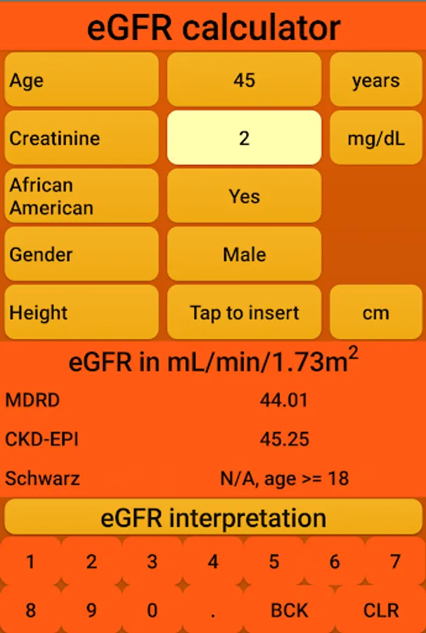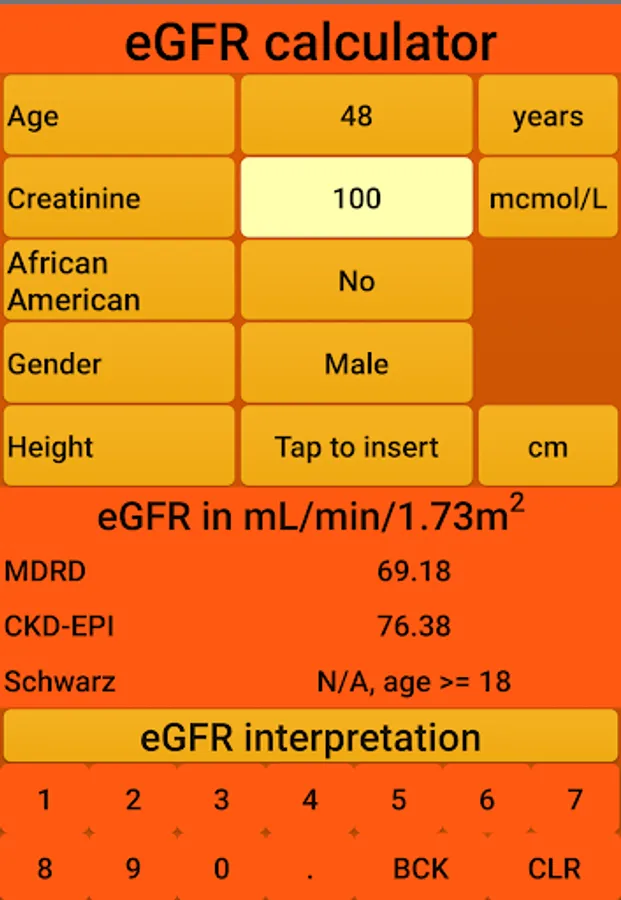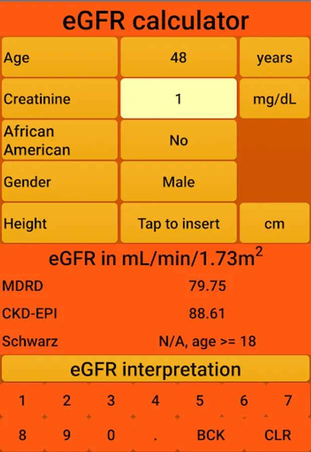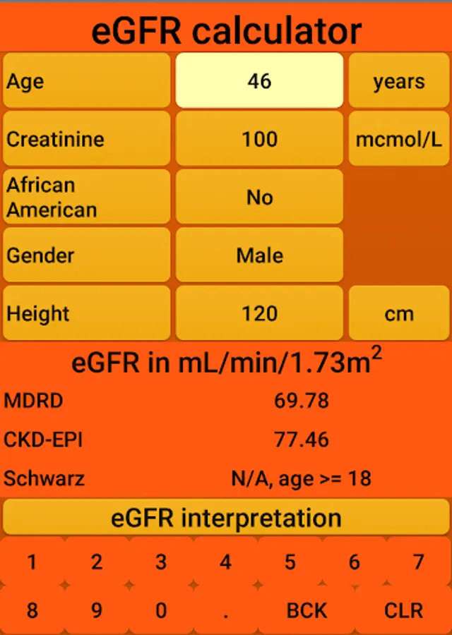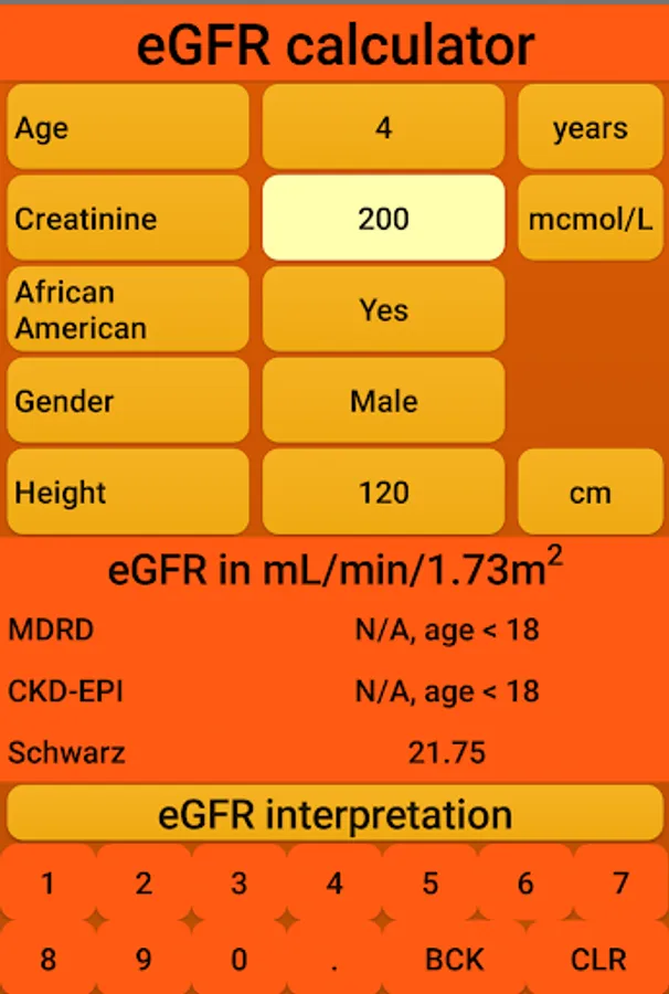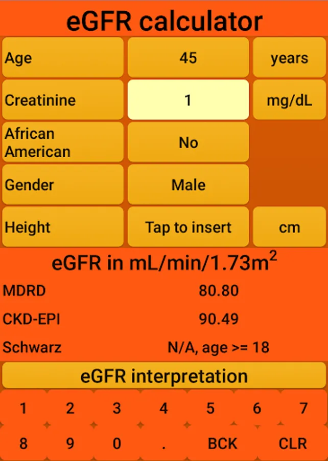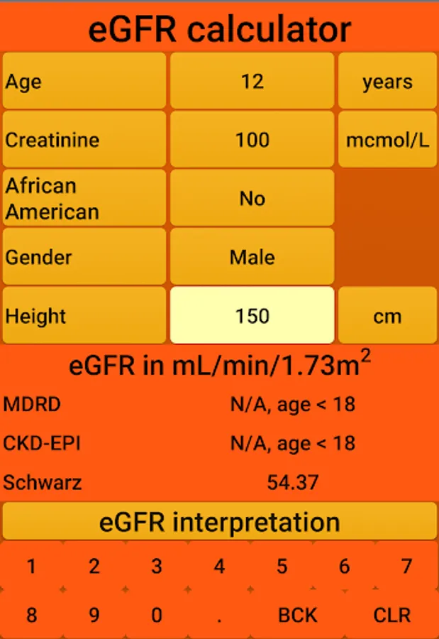 The app is quick and basic. Just enter the necessary information (age, creat and height for the Schwarz formula and age, creat, race and gender for the MDRD and CKDEPI formulas) and the app will immediately show the calculated eGFR values. No splash screens, no [calculate] button (the eGFR will appear as you type) and no values shown that are inappropriate like MDRD values for children. Just a small Google ad banner to support me in my efforts to produce free, fast, reliable and useful Android apps.