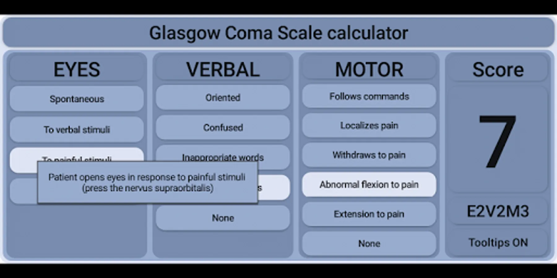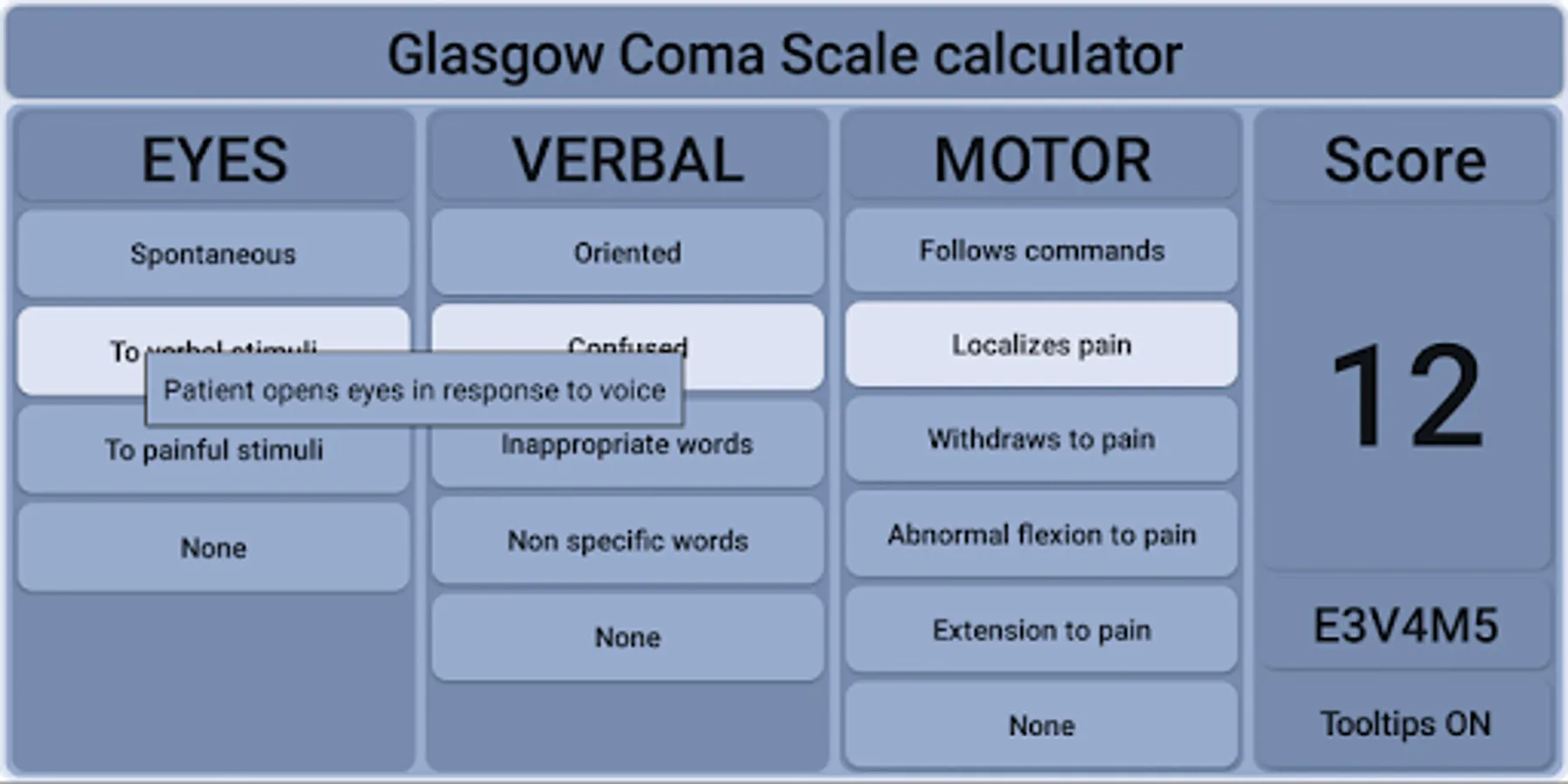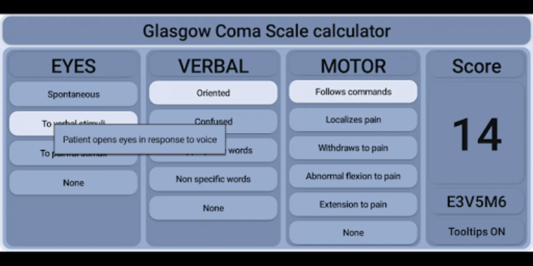 A complete one-screen Glasgow Coma Scale calculator to determine the Glasgow Coma Scale of your patient using the least amount of effort. Tooltips explaining each selection can be turned on and off. The app has been created to scale well on any device, so both phones and tablets will work fine.