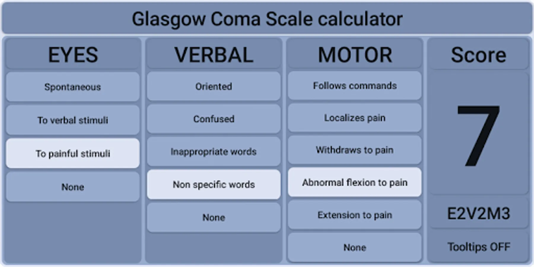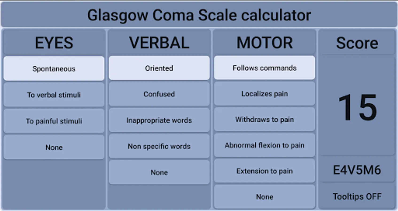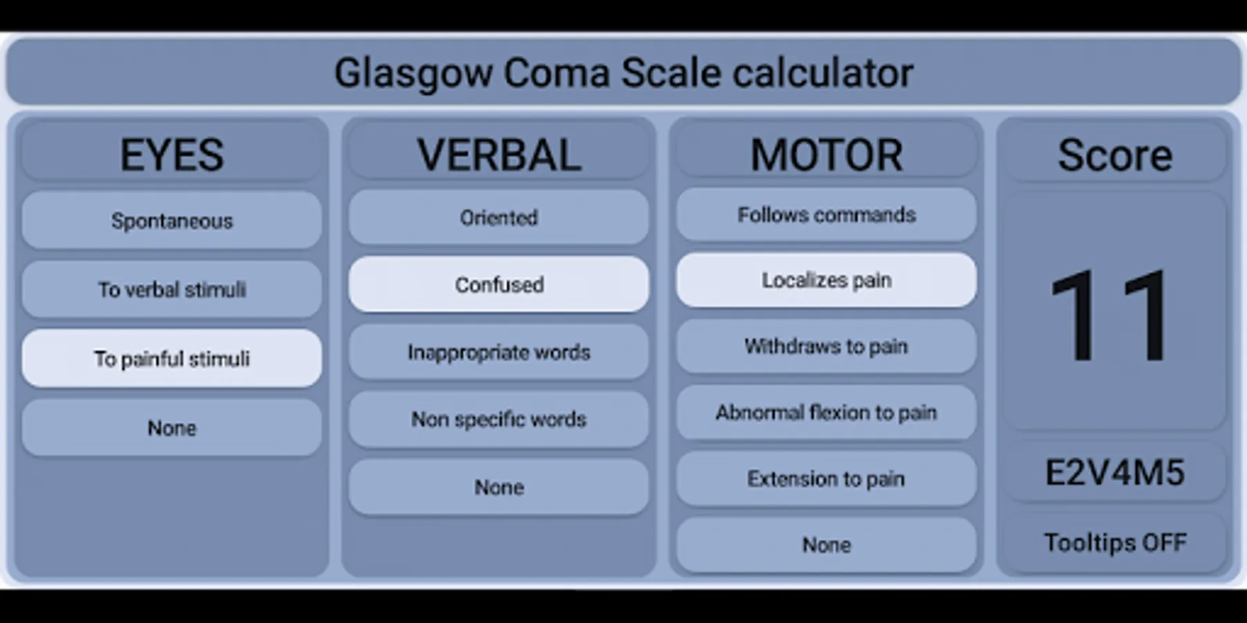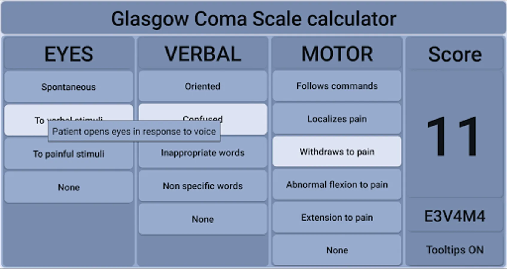 A complete one-screen Glasgow Coma Scale calculator to determine the Glasgow Coma Scale of your patient using the least amount of effort. Tooltips explaining each selection can be turned on and off. The app has been created to scale well on any device, so both phones and tablets will work fine.