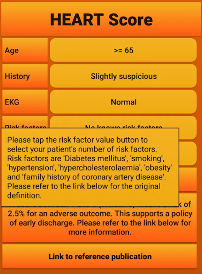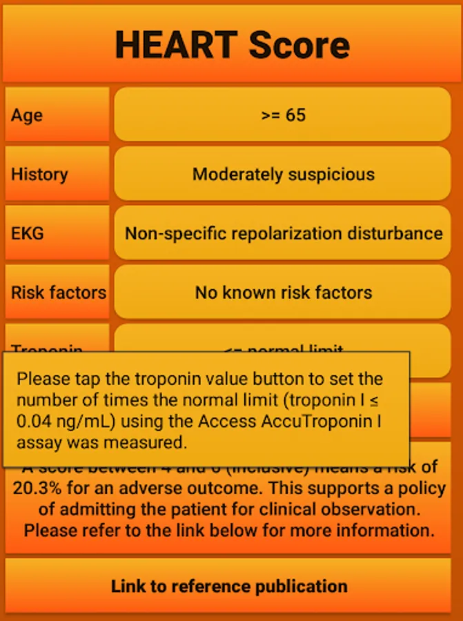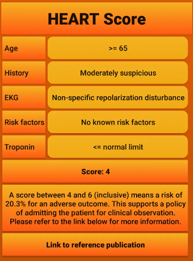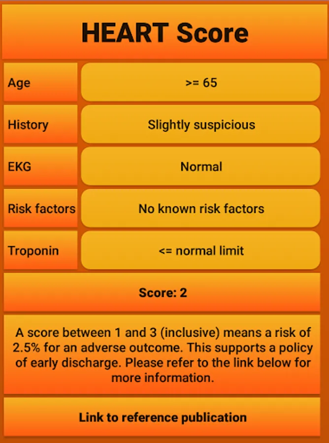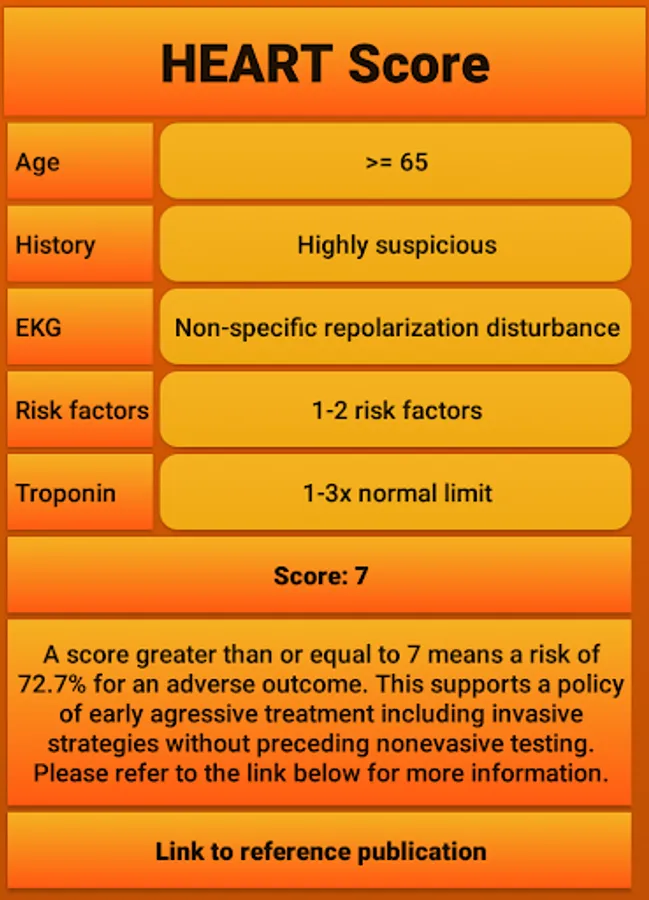 The HEART risk score can be used to determine the chance of a patient getting a myocardial infarction within the near future as described in https://www.ncbi.nlm.nih.gov/pmc/articles/PMC2442661/. The app consists of a very intuative and easy to use interface and includes a link to the original publication as a reference. The author of the app is not affiliated with the research group involved in creating the HEART score, but created the app as a convenient tool and reference.