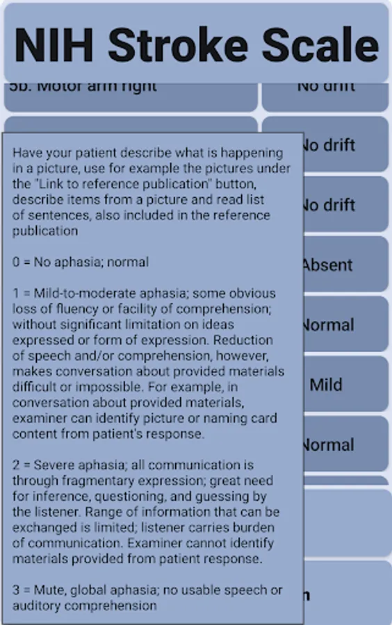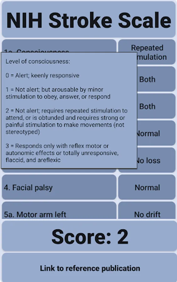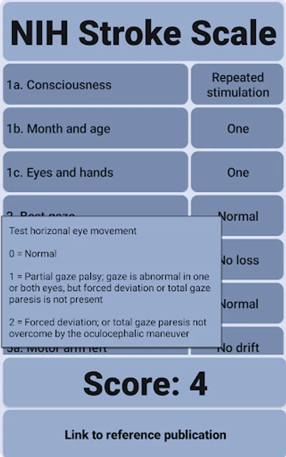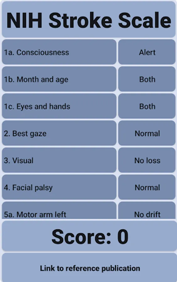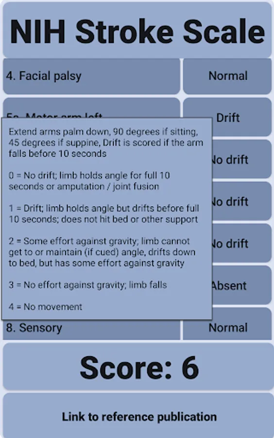 This is an implementation of the NIH stroke scale as defined in - https://www.stroke.nih.gov/documents/NIH_Stroke_Scale.pdf - The creator of this app is not associated with the NIH therefore a link to the original manuscript is included through a button in the user interface. The app was created to provide an easy to access reminder and calculator for bed side evaluation of a patient.