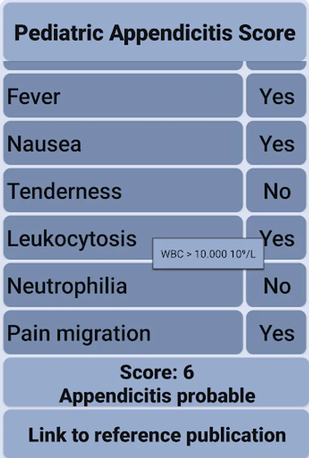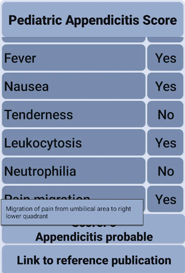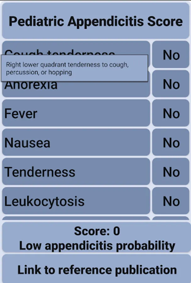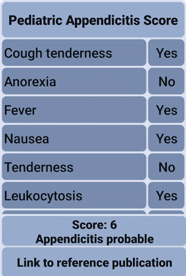 This app can be used as a bedside Pediatric appendicitis score calculator based on https://com-emergency.sites.medinfo.ufl.edu/files/2013/02/Pediatric-Appendicitis-Score.pdf - The creator of this app has no affiliation with the research group, but found a little reminder on the phone convenient when assessing patients.