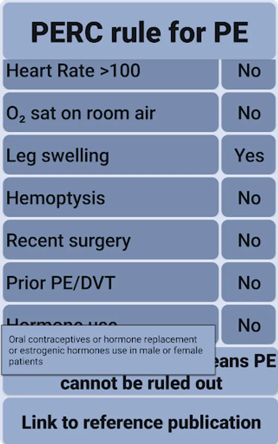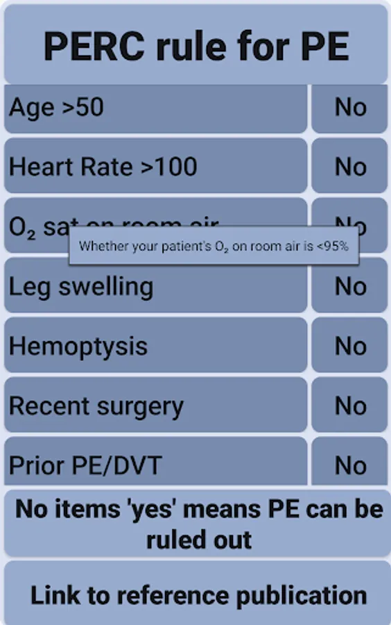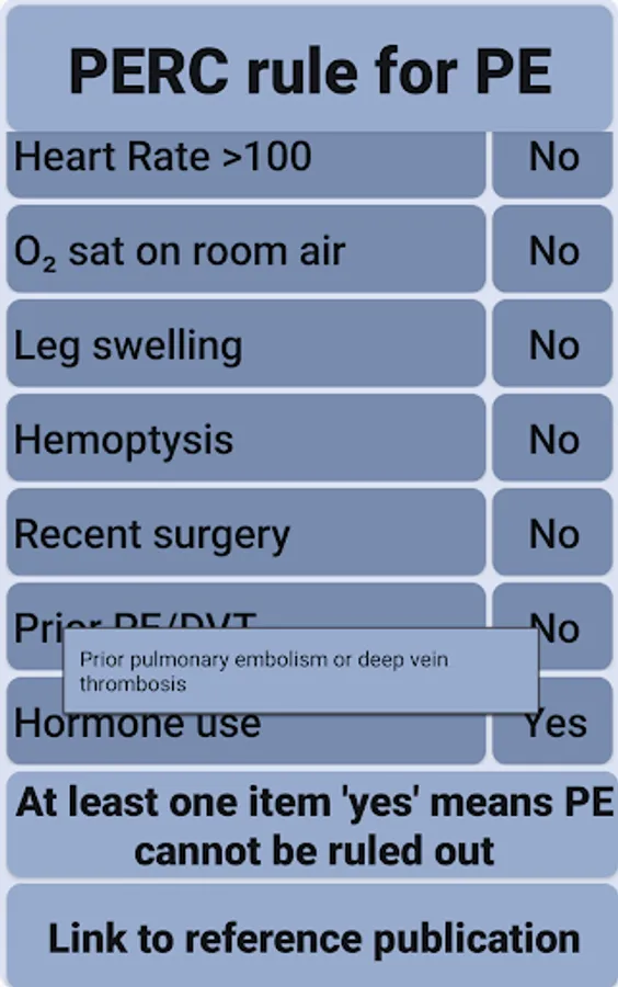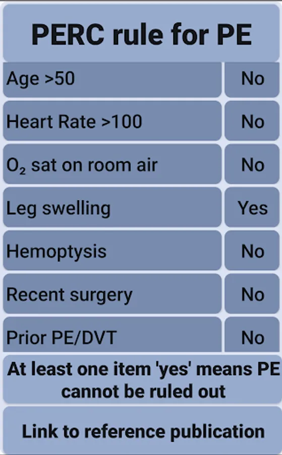 This app is a checklist based on https://onlinelibrary.wiley.com/doi/10.1111/j.1538-7836.2004.00790.x to determine whether PE/DVT can be ruled out considering the physiological parameters researched in the paper. The creator of this app has no affiliation with the research group, but found it convenient to have the PERC criteria in an app. A link to the original article is included in the apps GIU