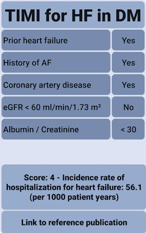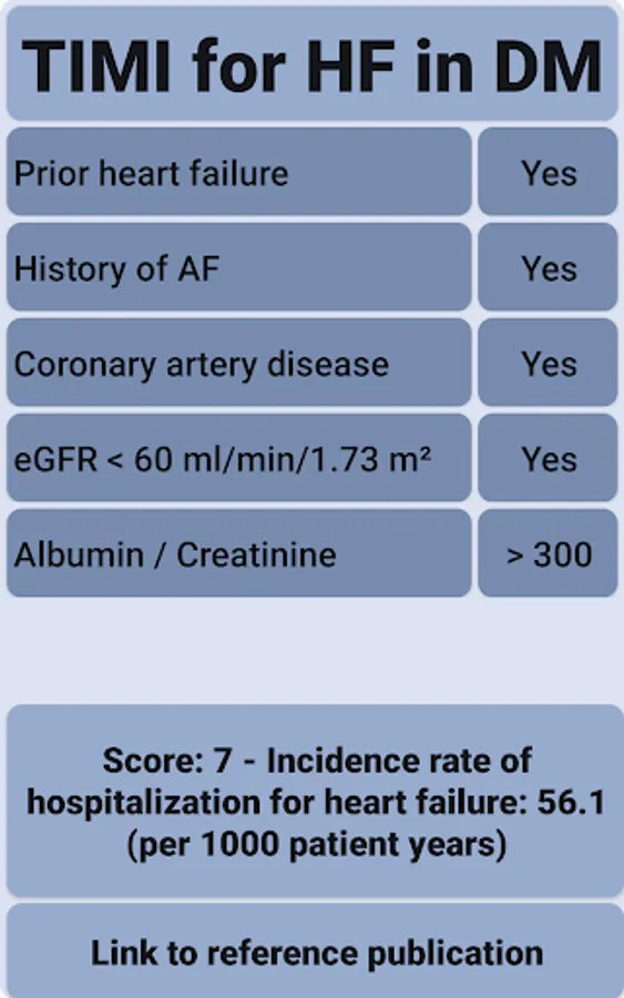 This app helps you to easily calculate the TIMI score for heart failure in diabetes mellitus as defined on https://timi.org/timi-risk-score-for-hf-in-diabetes/ - The developer of this app is not affiliated with the research group.