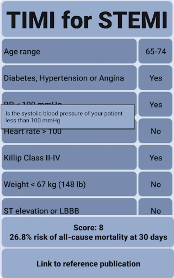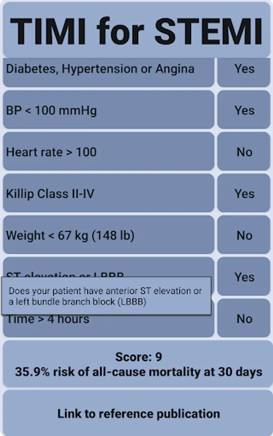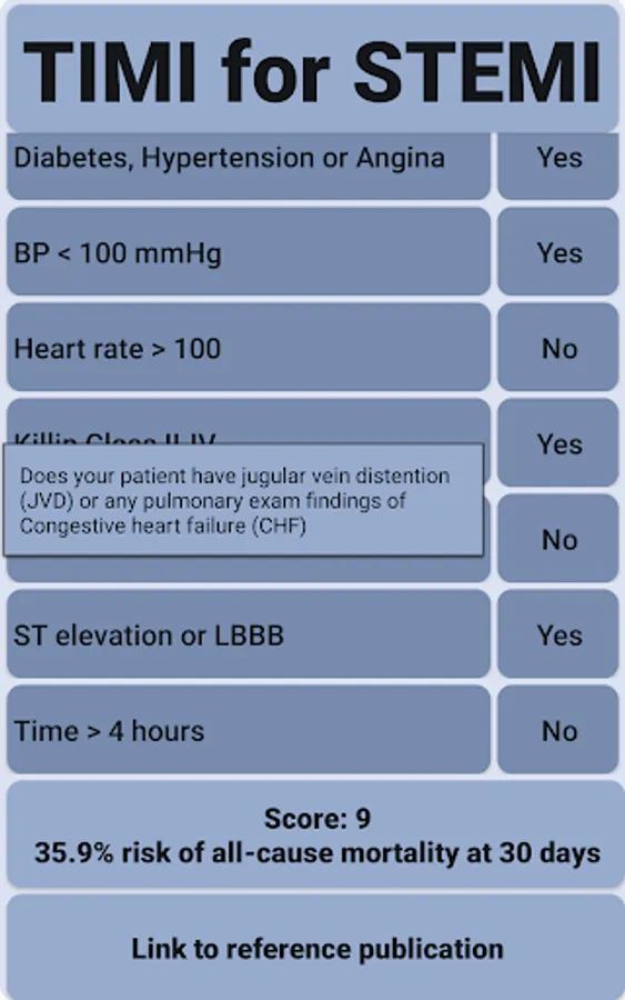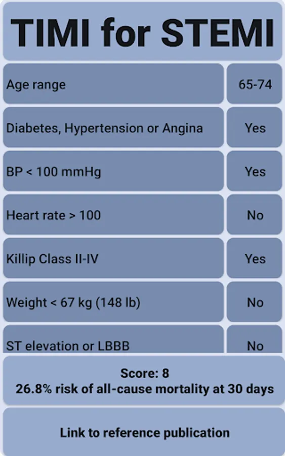 This app calculates the TIMI score for STEMI as defined in - https://en.wikipedia.org/wiki/TIMI. It can be used as an easy in-pocket bedside reminder/calculator for the parameters determining the TIMI score for STEMI