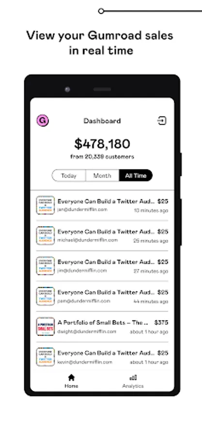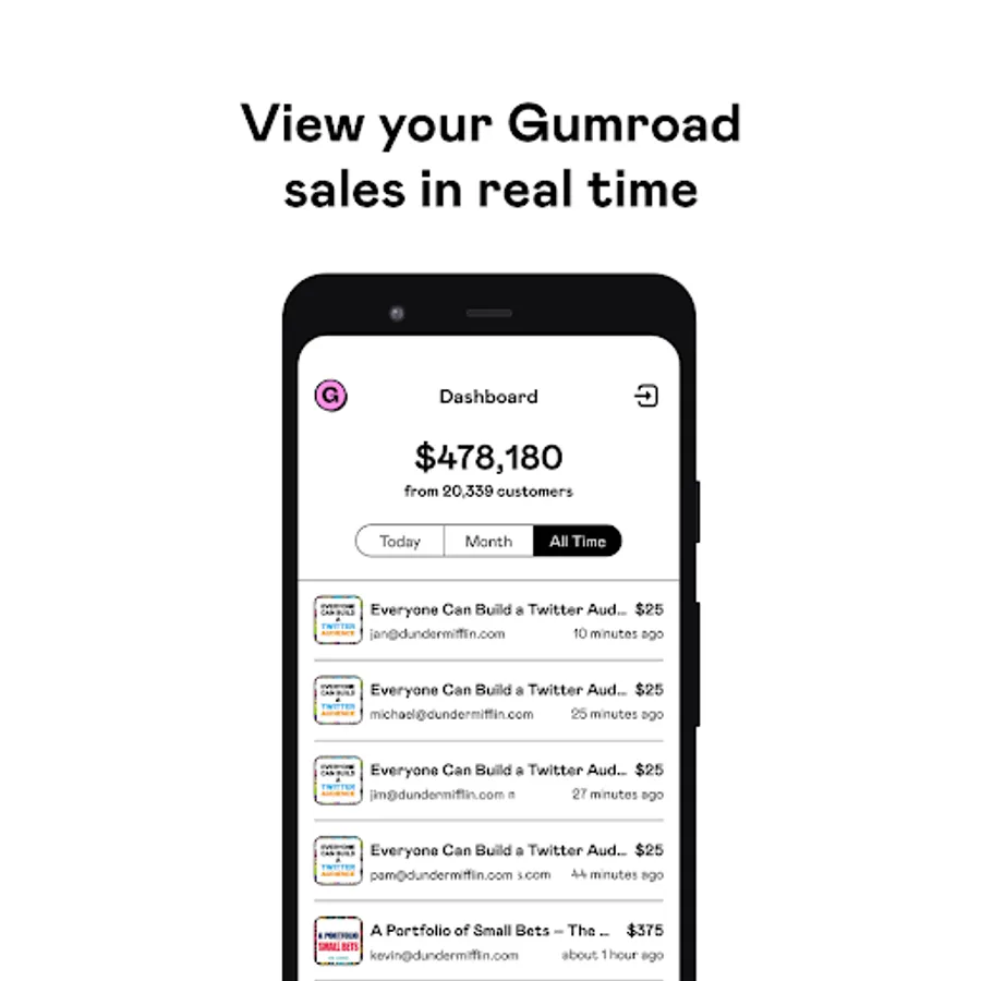 Gumroad creators—your Dashboard app is here! In real time, you can track your daily, monthly, and all-time sales on Gumroad (pre-fees). Allow for push notifications and you’ll be alerted when you make a sale.