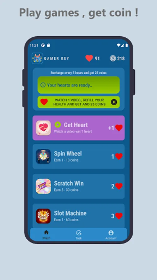 Earn coins by playing games within the Gamer Key app. Buy game codes with the coins you earn.