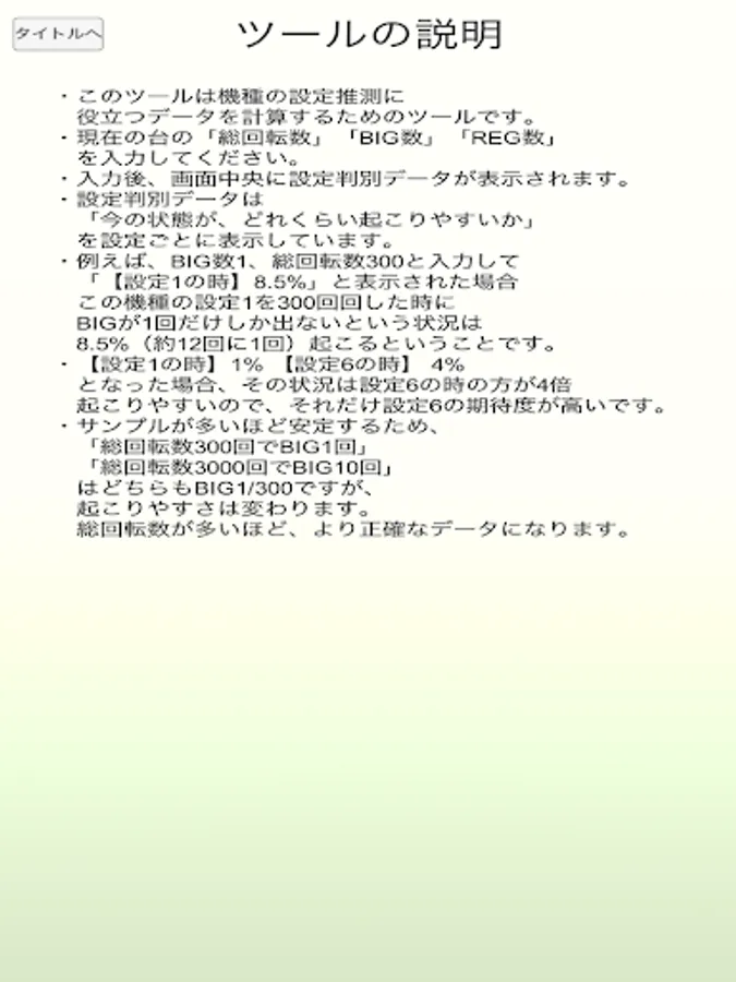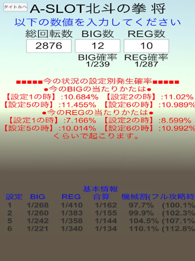 総回転数、BIG回数、REG回数を入れるだけですぐに設定推測できます。
