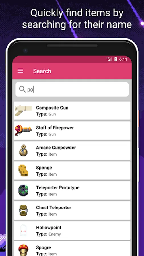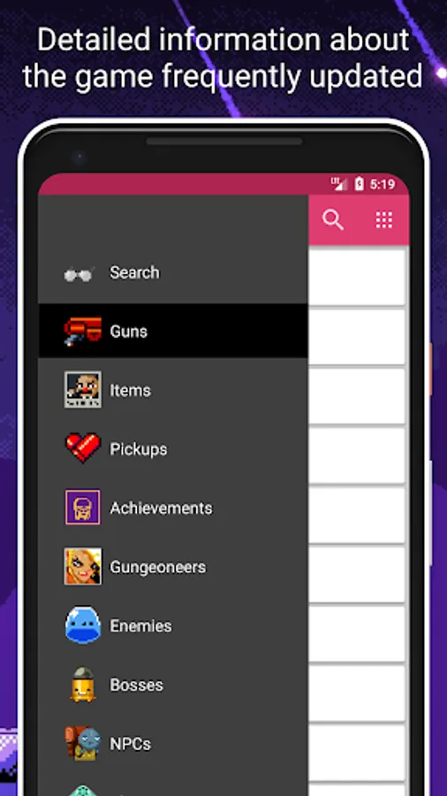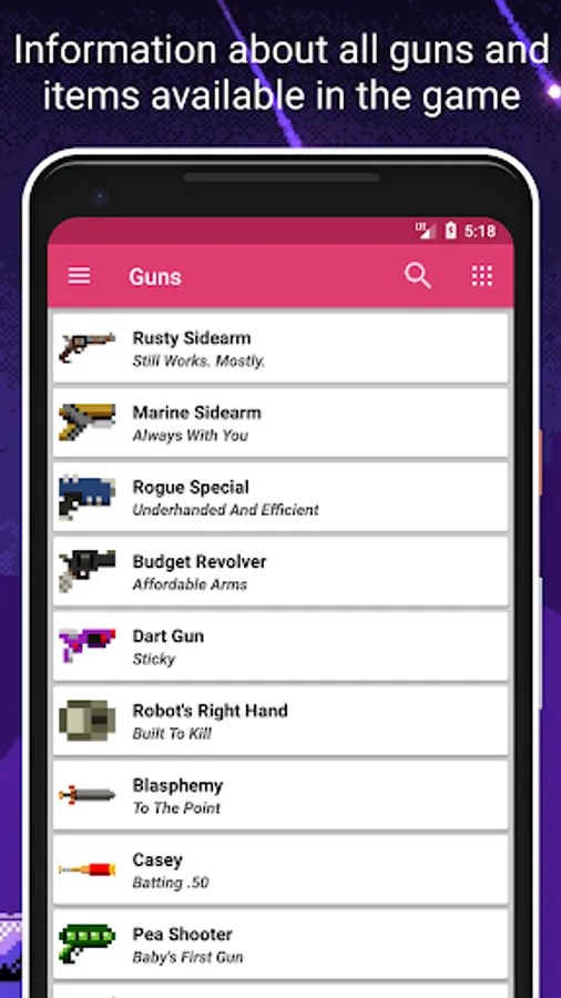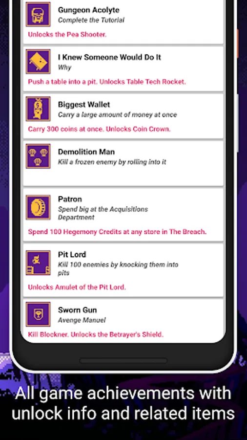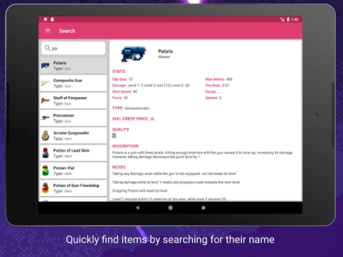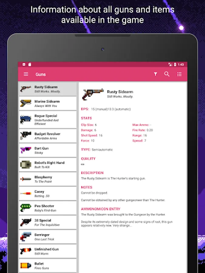 Quickly find all the information you need about the game Enter the Gungeon. Includes a global search where you can rapidly find the detailed info about the guns and items you encounter during your gameplay.