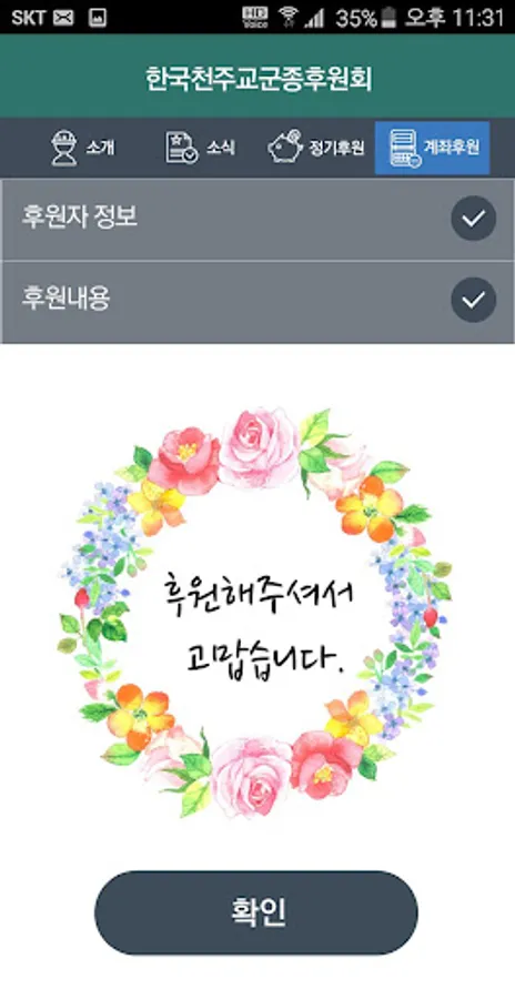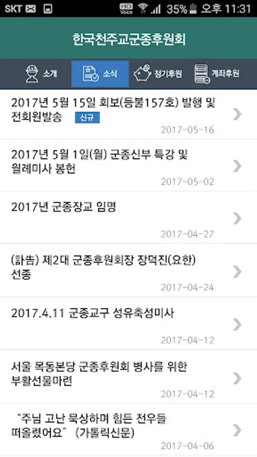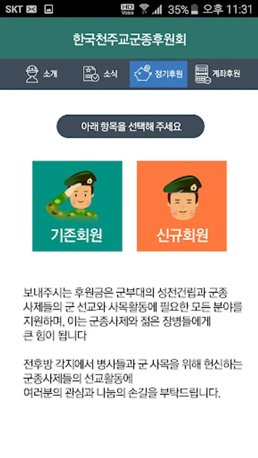 4. 계좌후원 : 법인명의의 군종후원회 계좌로 후원하실 수 있습니다. [주요기능] 1. 초기화면 : 군종후원회 앱 주요 메뉴(군종후원회 소식, 정기후원 및 계좌후원 )를 한 눈에 확인하실 수 있습니다. 2. 소식 : 월례미사 및 각종 행사와 관련된 군종후원회 소식을 빠르게 알려드립니다. 3. 정기후원 : 서면 작성이 아닌 간단한 내용입력과 전자서명을 통해 편리하게 자동이체 후원 신청이 가능합니다.
