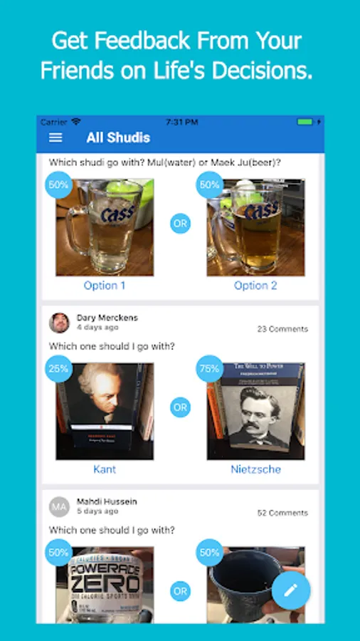 Shudi is a social app where you can create "Shudi's" and invite your friends to vote & comment on everyday decisions in your life!
