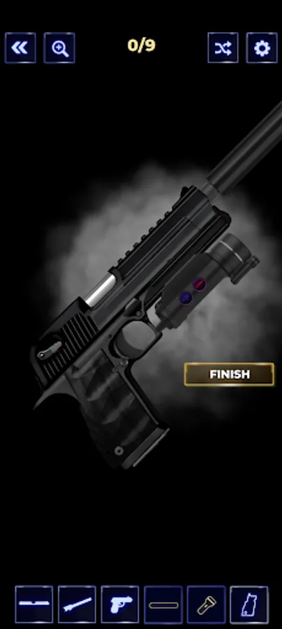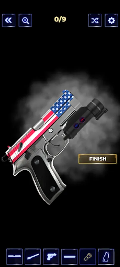 Try out your gun shooting skills in the built-in shooting range game and score as many points as you can to unlock new levels. Put your knowledge to practice and enjoy many options in this free weapon builder app. The settings menu lets you adjust: vibration, flash, game speed, unlimited ammo, mirror effect and menu music. You can also change the background sound, and also graphic and background effects to create the best looking custom gun images, which you can share with your friends who also love gun games.
