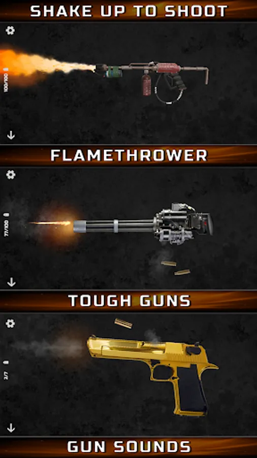 Each user of the gun app can adjust the camera flash while shooting, whether it will be on or off. Vibration can be included or not, it depends on the user’s wish, and can be turned on or off anytime. Unlimited ammo and mirror mode can both be adjusted as well. Set everything the way you like it and you are ready to try out the weapons and shoot!