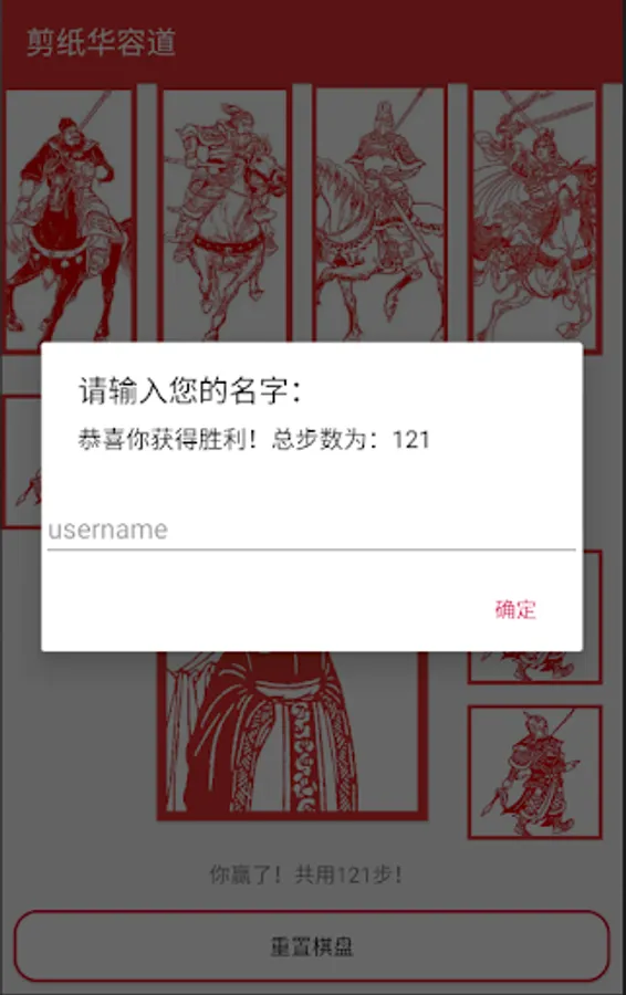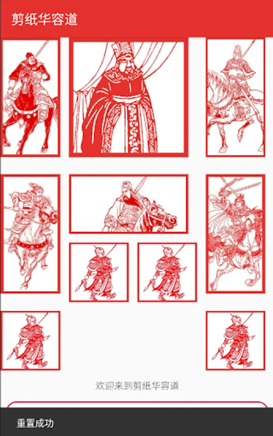 This game combines the traditional Klotski game and Chinese paper cutting art. Paper cutting is a traditional art in China. People glued the papercuts to the exterior of windows, so the light from the inside would shine through the negative space of the cutout. Usually, the artworks are made of red paper, as red is associated with festivities and happiness in Chinese culture, but other colours were also used. Normally paper-cutting artwork is used on festivals like Spring Festival, weddings and childbirth. Papercuts always symbolize luck and happiness.