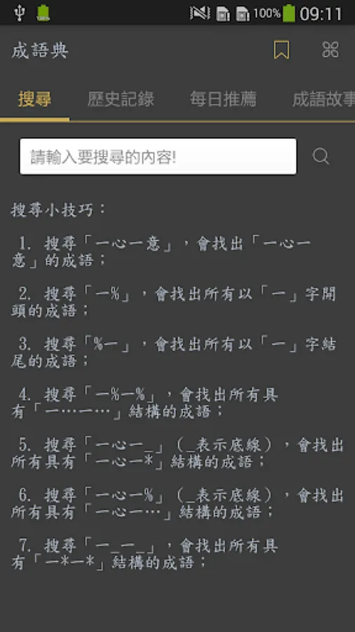 4. Searching for "一%一%" will find all idioms with the structure of "一…一…";
