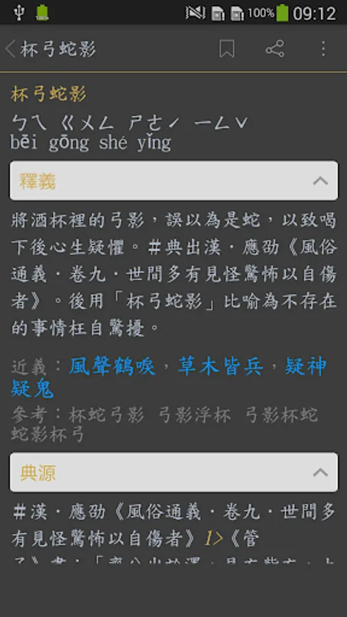 * Each idiom includes definition, source, pinyin, reference words, synonyms, antonyms, paraphrase, allusion, allusion description, documentary evidence, usage description, identification, etc.;